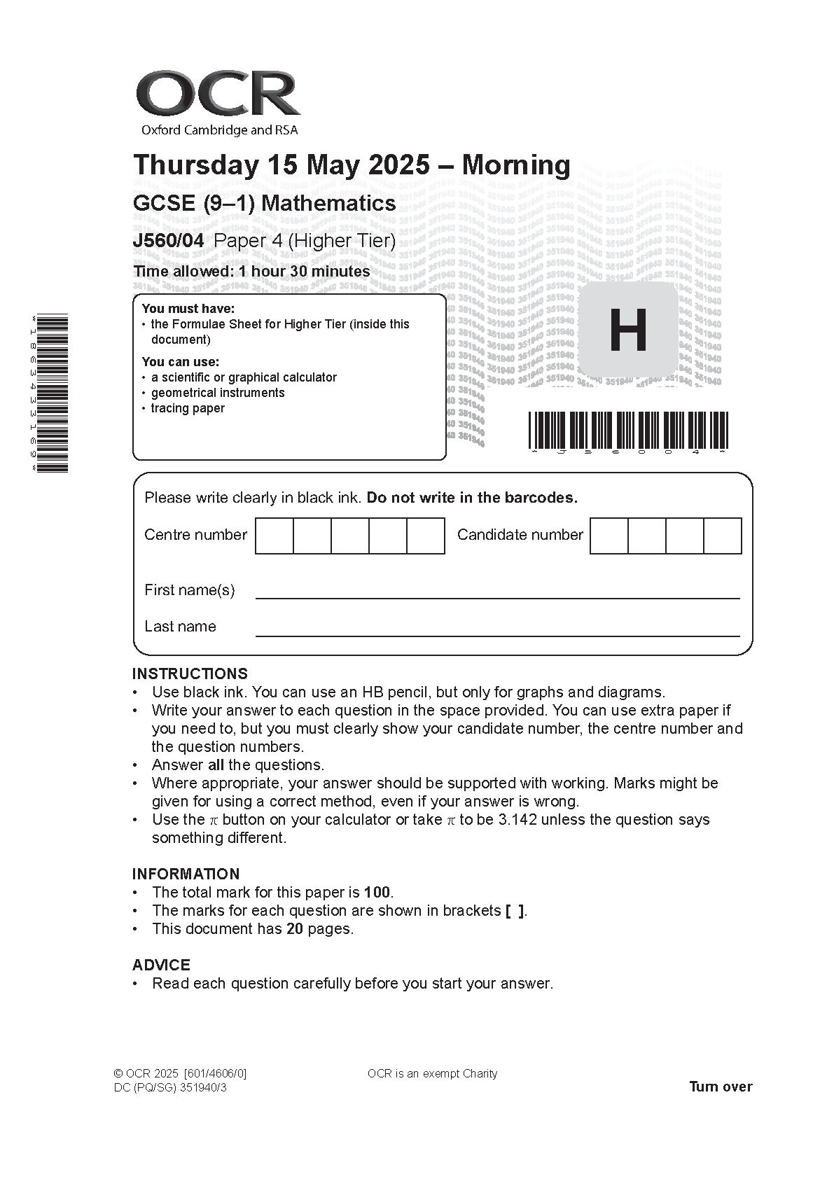 2025 OCR GCSE Mathematics Paper 4 and Mark Scheme Combined (J560/04 Paper 4 (Higher Tier)). 2025 OCR GCSE Mathematics Paper 4 and Mark Scheme Combined (J560/04 Paper 4 (Higher Tier)) OCR GCSE Papers & mark schemes