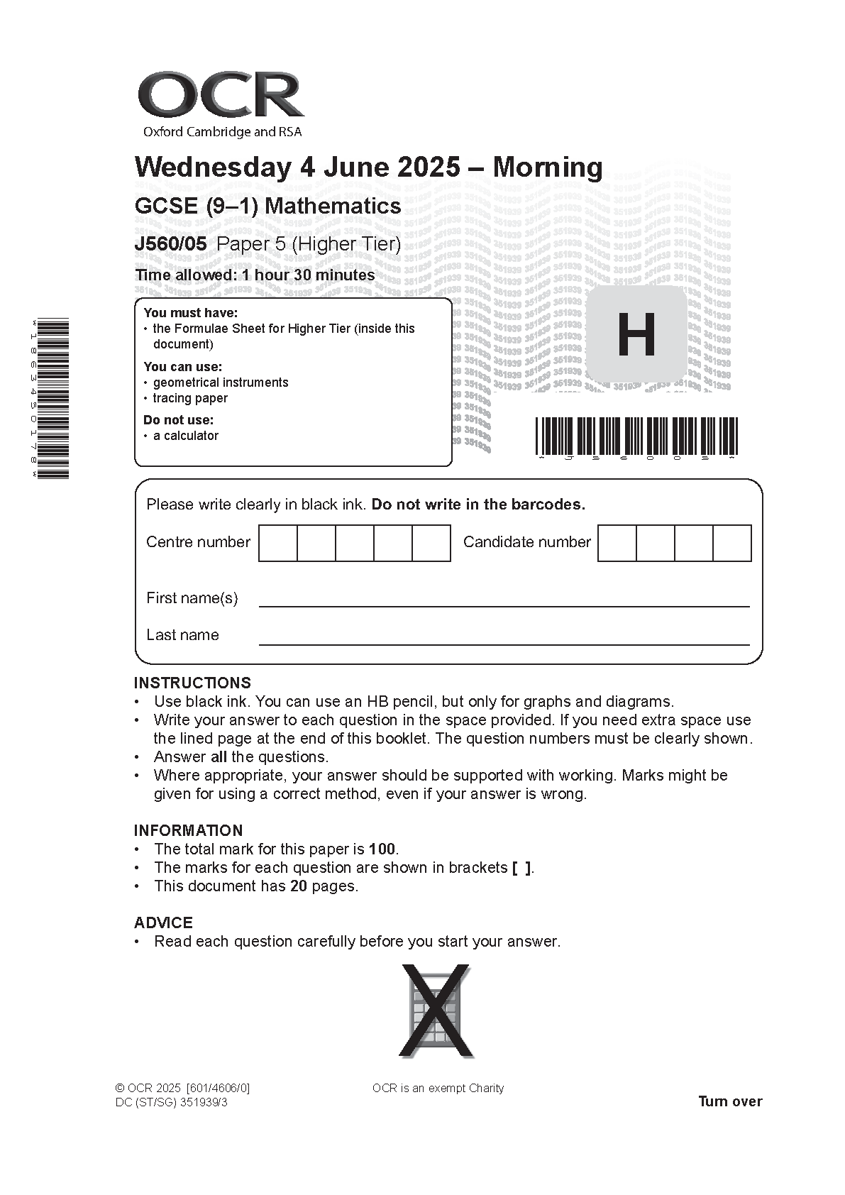 2025 OCR GCSE Mathematics Paper 5 and Mark Scheme Combined (J560/05 Paper 5 (Higher Tier). 2025 OCR GCSE Mathematics Paper 5 and Mark Scheme Combined (J560/05 Paper 5 (Higher Tier) OCR GCSE Papers & mark schemes