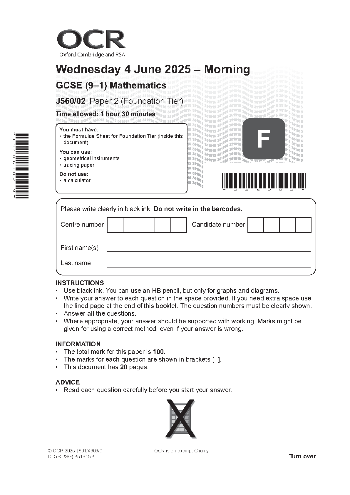 2025 OCR GCSE Mathematics Paper 2 and Mark Scheme Combined (J560/02 Paper 2 (Foundation Tier). 2025 OCR GCSE Mathematics Paper 2 and Mark Scheme Combined (J560/02 Paper 2 (Foundation Tier) OCR GCSE Papers & mark schemes