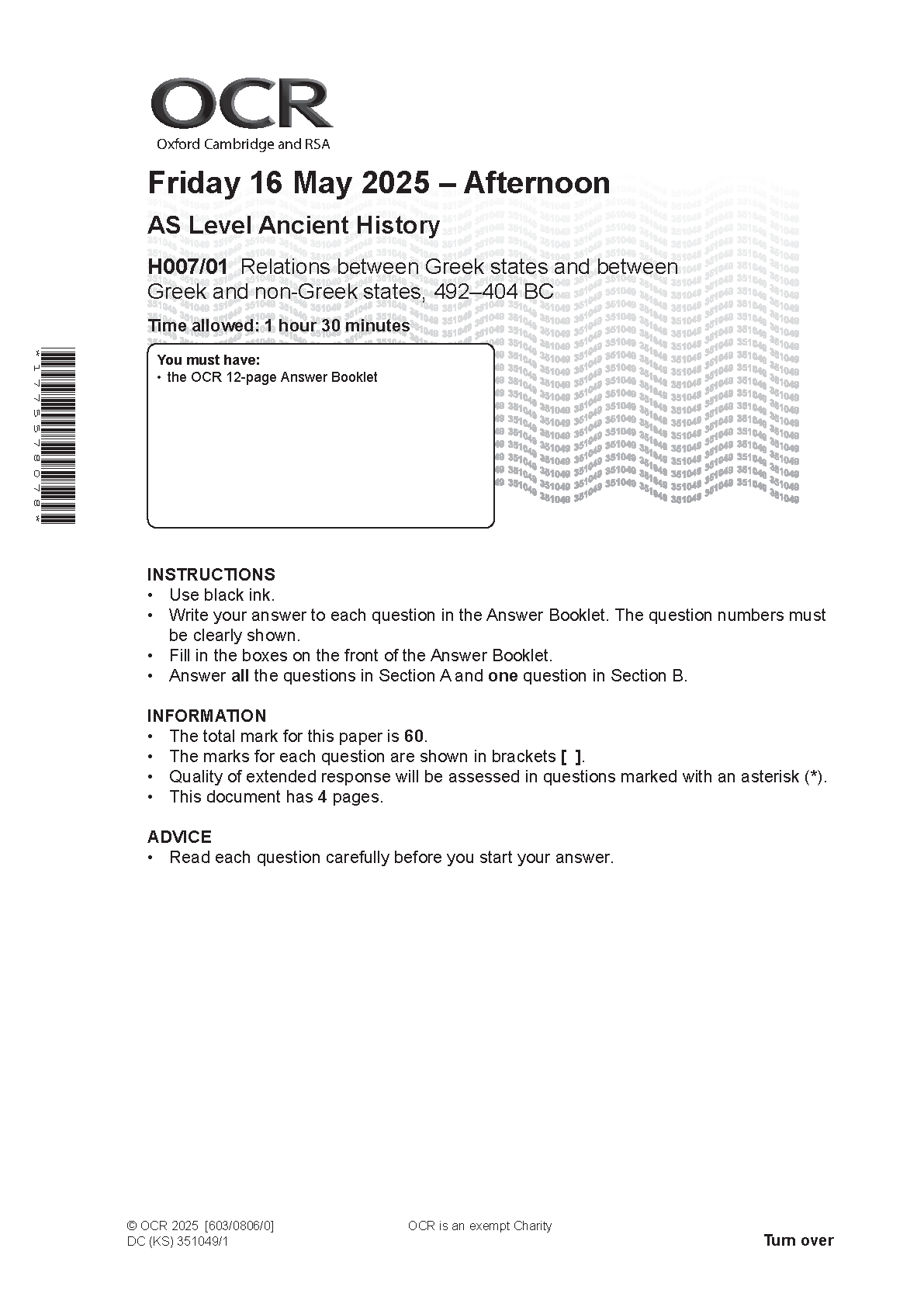 2025 OCR AS Level Ancient History Paper 1 and Mark Scheme Combined (H007/01 Relations between Greek states and between Greek and non‑Greek states, 492–404 BC). 2025 OCR AS Level Ancient History Paper 1 and Mark Scheme Combined (H007/01 Relations between Greek states and between Greek and non‑Greek states, 492–404 BC) OCR GCE A & AS LEVEL Papers and Mark Schemes