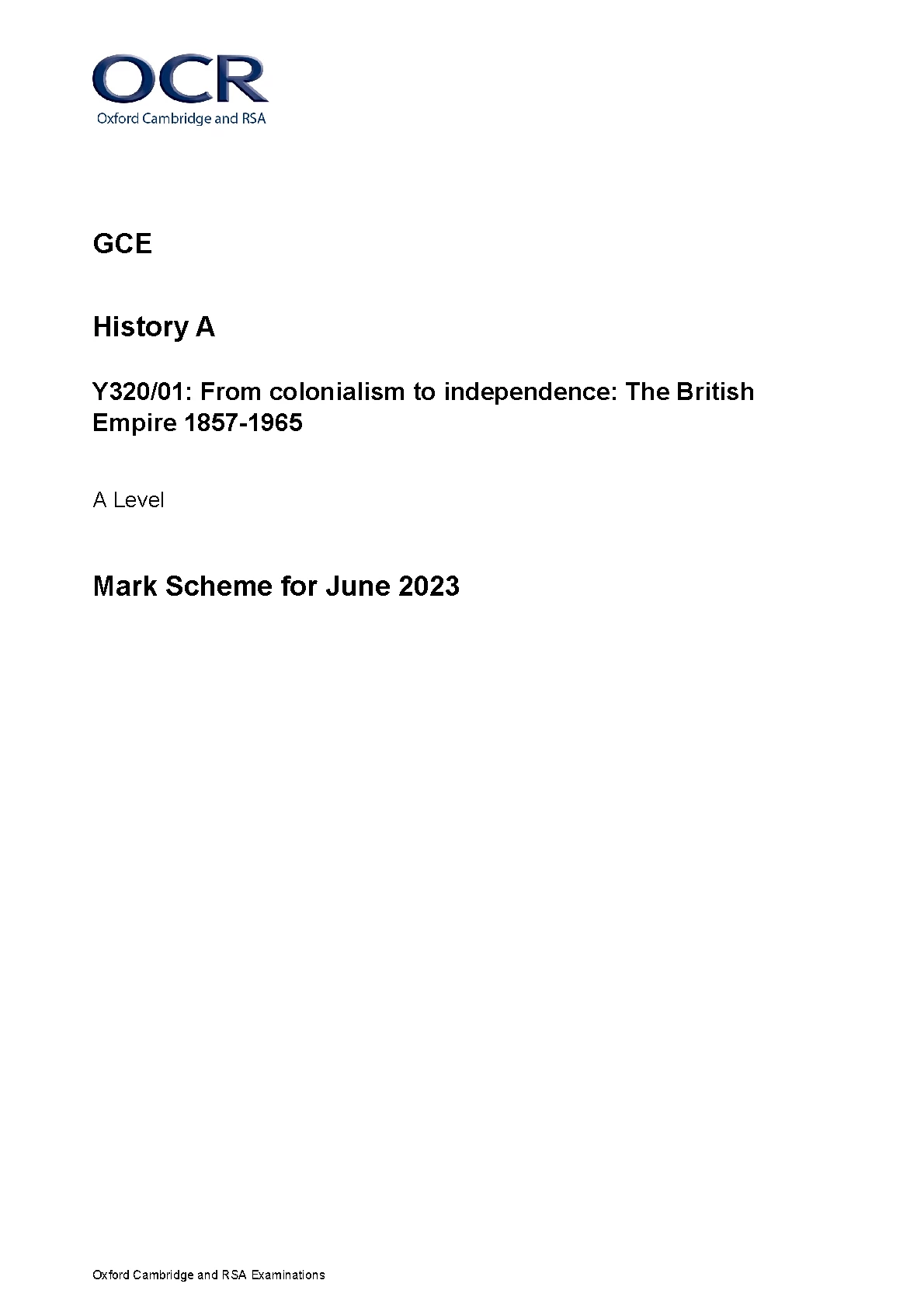 OCR GCE A LEVEL HISTORY A PAPER 1 MARK SCHEME 2023 (Y320/01: From colonialism to independence: The British Empire 1857-1965). OCR GCE A LEVEL HISTORY A PAPER 1 MARK SCHEME 2023 (Y320/01: From colonialism to independence: The British Empire 1857-1965) OCR GCE A & AS LEVEL Papers and Mark Schemes