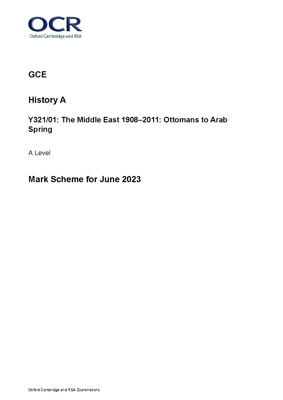 OCR GCE A LEVEL HISTORY A PAPER 1 MARK SCHEME 2023 (Y321/01: The Middle East 1908–2011: Ottomans to Arab Spring). OCR GCE A LEVEL HISTORY A PAPER 1 MARK SCHEME 2023 (Y321/01: The Middle East 1908–2011: Ottomans to Arab Spring) OCR GCE A & AS LEVEL Papers and Mark Schemes