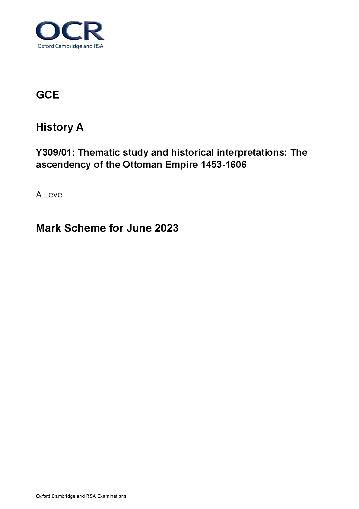 OCR GCE A LEVEL HISTORY A PAPER 1 MARK SCHEME 2023 (Y309/01: The Ascendancy of the Ottoman Empire 1453–1606). OCR GCE A LEVEL HISTORY A PAPER 1 MARK SCHEME 2023 (Y309/01: The Ascendancy of the Ottoman Empire 1453–1606) OCR GCE A & AS LEVEL Papers and Mark Schemes