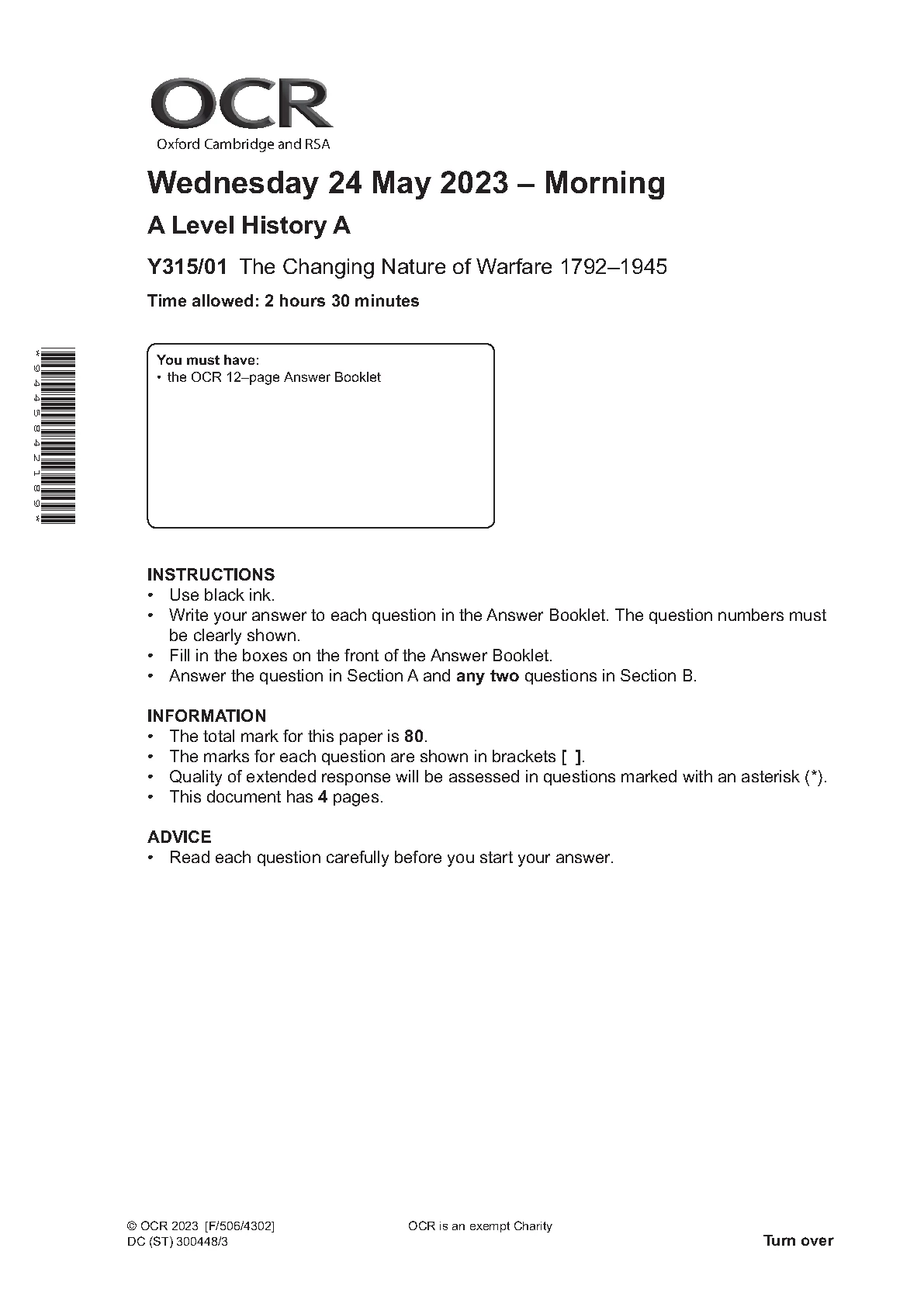OCR GCE A LEVEL HISTORY A PAPER 1 QUESTION PAPER 2023 (Y315/01: The Changing Nature of Warfare 1792–1945). OCR GCE A LEVEL HISTORY A PAPER 1 QUESTION PAPER 2023 (Y315/01: The Changing Nature of Warfare 1792–1945) OCR GCE A & AS LEVEL Papers and Mark Schemes