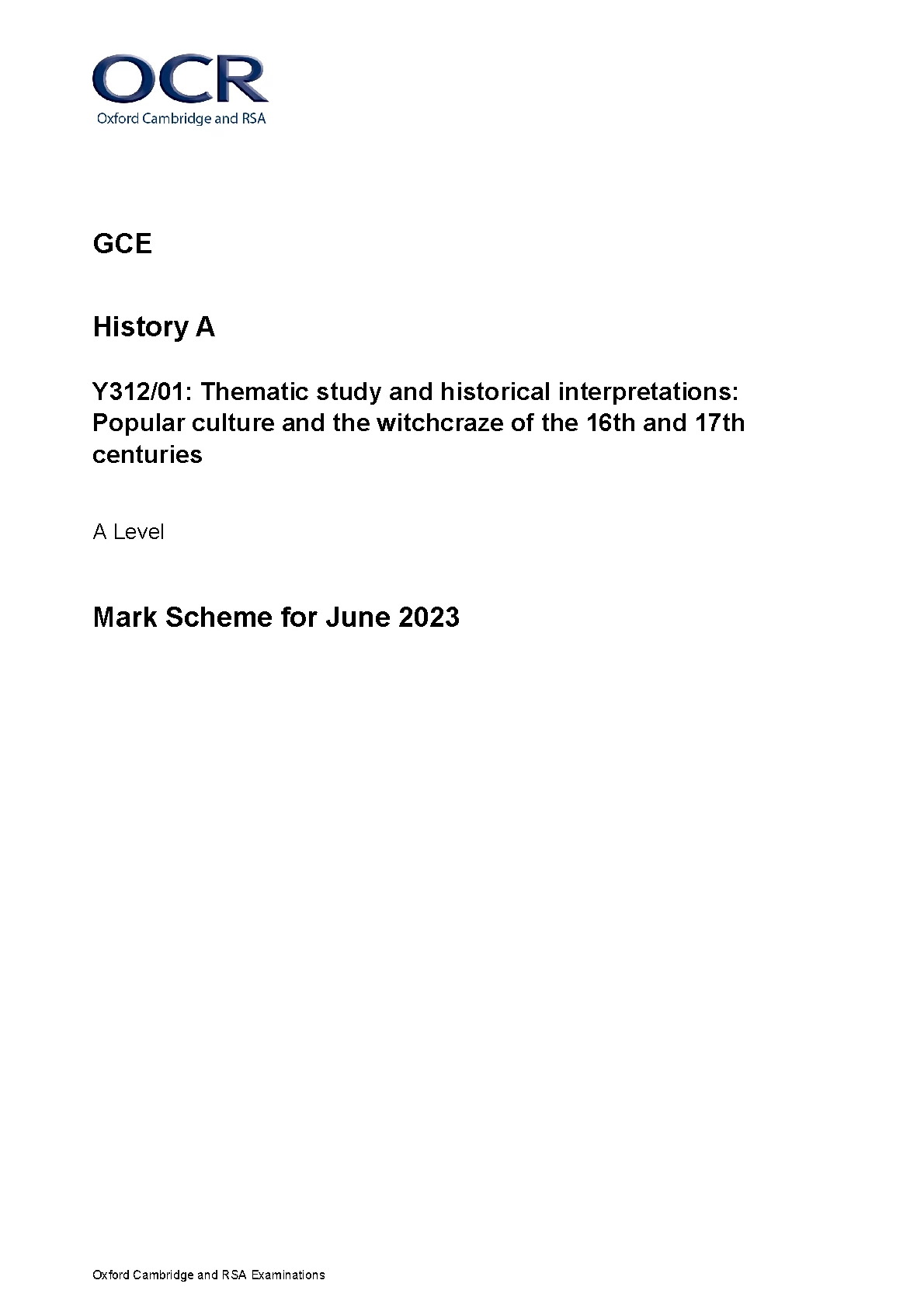 OCR GCE A LEVEL HISTORY A PAPER 1 MARK SCHEME 2023 (Y312/01: Popular Culture and the Witchcraze of the 16th and 17th Centuries). OCR GCE A LEVEL HISTORY A PAPER 1 MARK SCHEME 2023 (Y312/01: Popular Culture and the Witchcraze of the 16th and 17th Centuries) OCR GCE A & AS LEVEL Papers and Mark Schemes