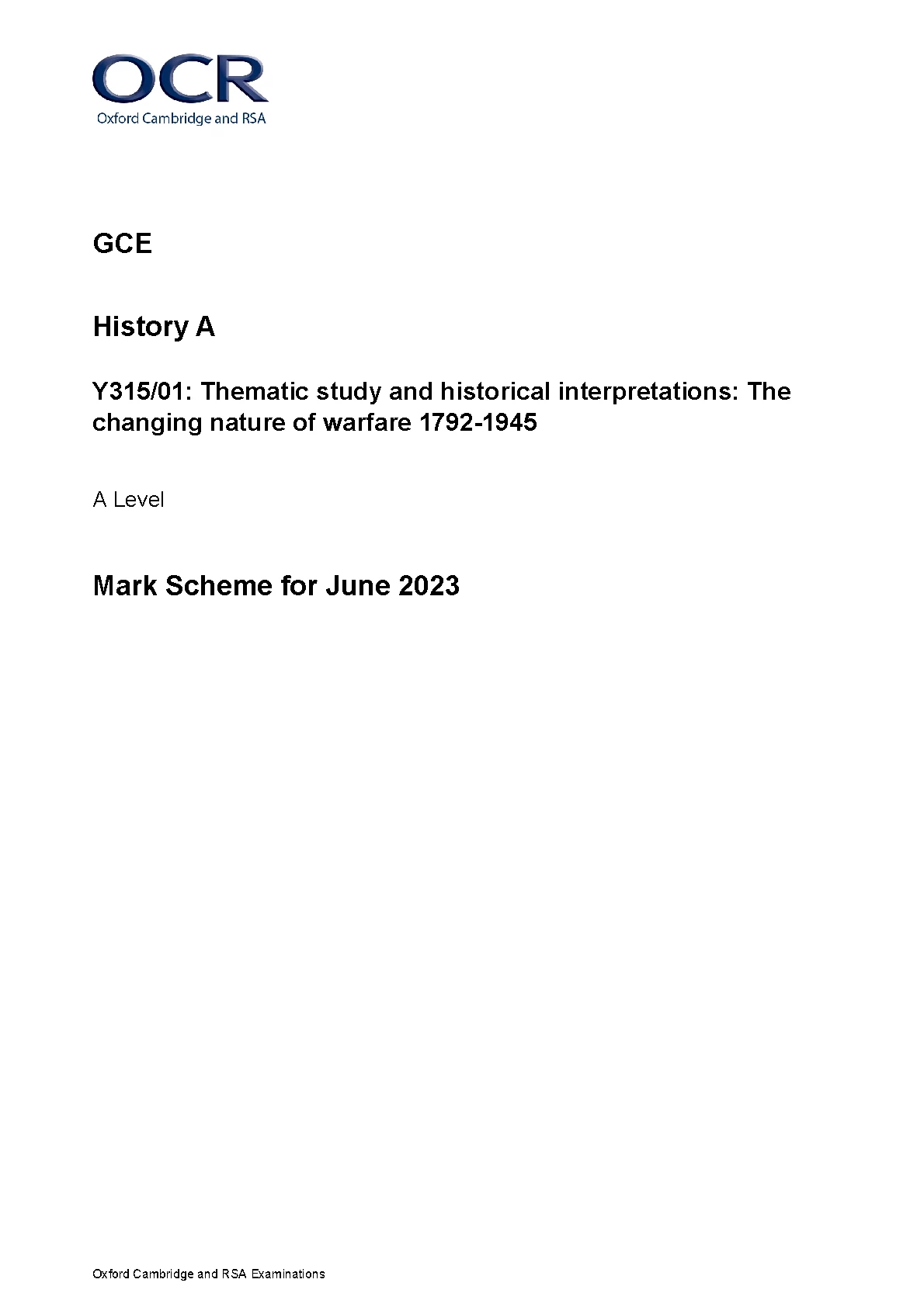 OCR GCE A LEVEL HISTORY A PAPER 1 MARK SCHEME 2023 (Y315/01: The Changing Nature of Warfare 1792–1945). OCR GCE A LEVEL HISTORY A PAPER 1 MARK SCHEME 2023 (Y315/01: The Changing Nature of Warfare 1792–1945) OCR GCE A & AS LEVEL Papers and Mark Schemes