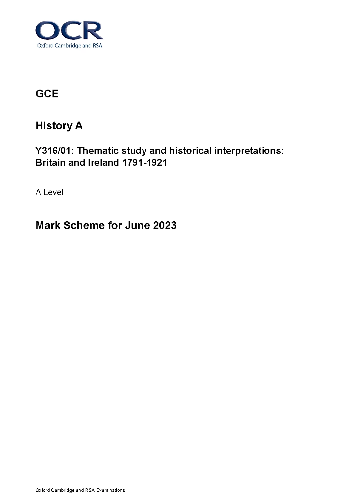OCR GCE A LEVEL HISTORY A PAPER 1 MARK SCHEME 2023 (Y316/01: Britain and Ireland 1791–1921). OCR GCE A LEVEL HISTORY A PAPER 1 MARK SCHEME 2023 (Y316/01: Britain and Ireland 1791–1921) OCR GCE A & AS LEVEL Papers and Mark Schemes