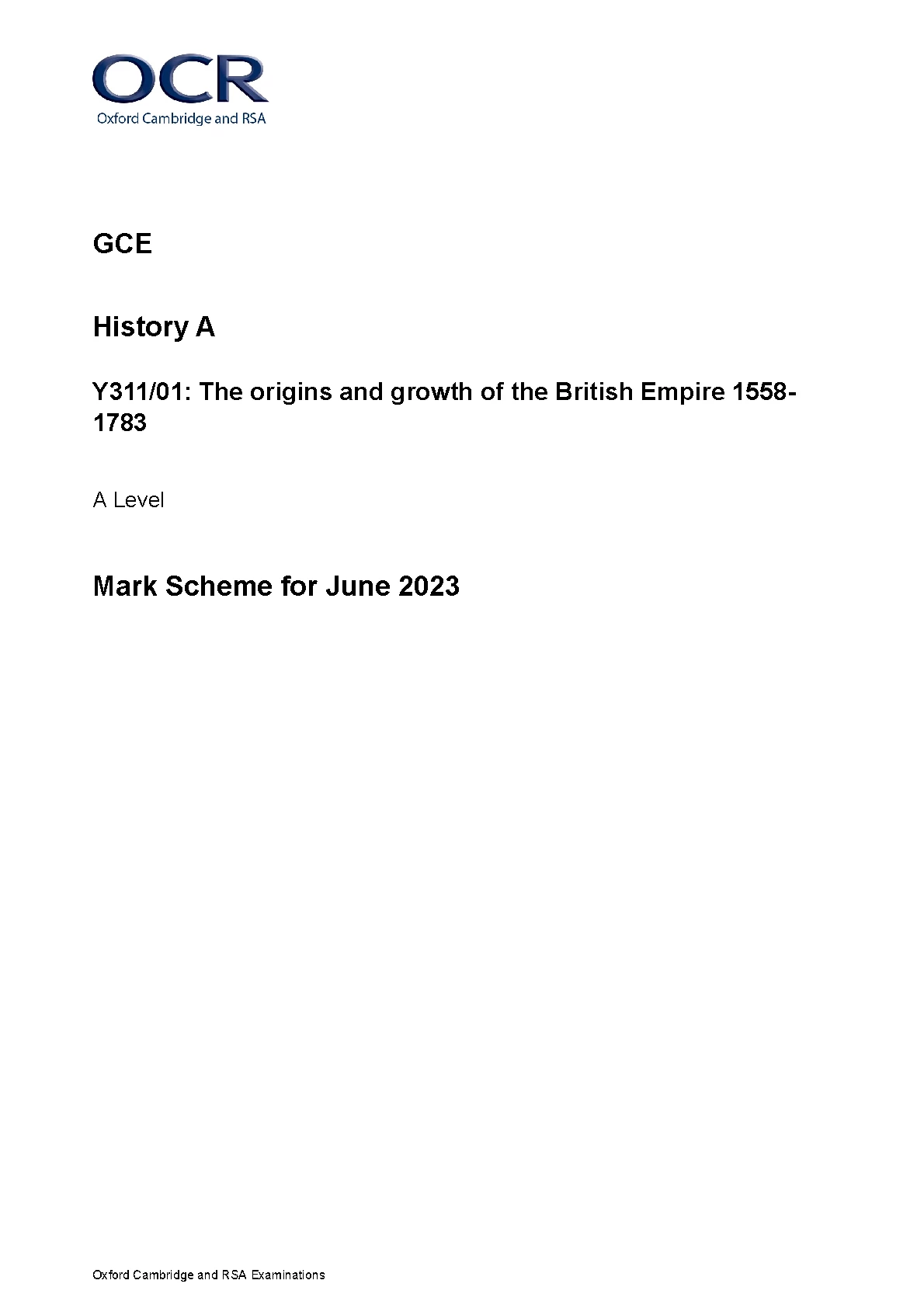 OCR GCE A LEVEL HISTORY A PAPER 1 MARK SCHEME 2023 (Y311/01: The Origins and Growth of the British Empire 1558–1783). OCR GCE A LEVEL HISTORY A PAPER 1 MARK SCHEME 2023 (Y311/01: The Origins and Growth of the British Empire 1558–1783) OCR GCE A & AS LEVEL Papers and Mark Schemes