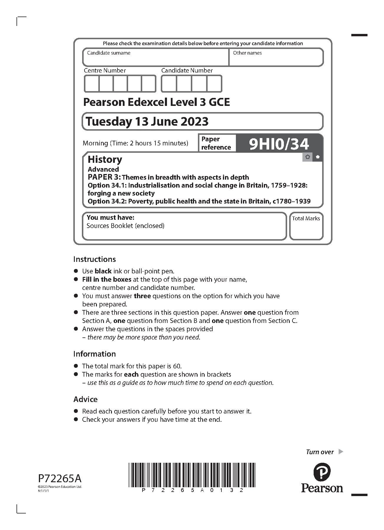 PEARSON EDEXCEL A LEVEL History PAPER 3 2023 QUESTION PAPER (9HI0/34: Option 34.1: Industrialisation and social change in Britain, 1759–1928: forging a new society & Option 34.2: Poverty, public health and the state in Britain, c1780–1939). PEARSON EDEXCEL A LEVEL History PAPER 3 2023 QUESTION PAPER (9HI0/34: Option 34.1: Industrialisation and social change in Britain, 1759–1928: forging a new society & Option 34.2: Poverty, public health and the state in Britain, c1780–1939) Pearson Edexcel A and AS Papers and Mark Schemes