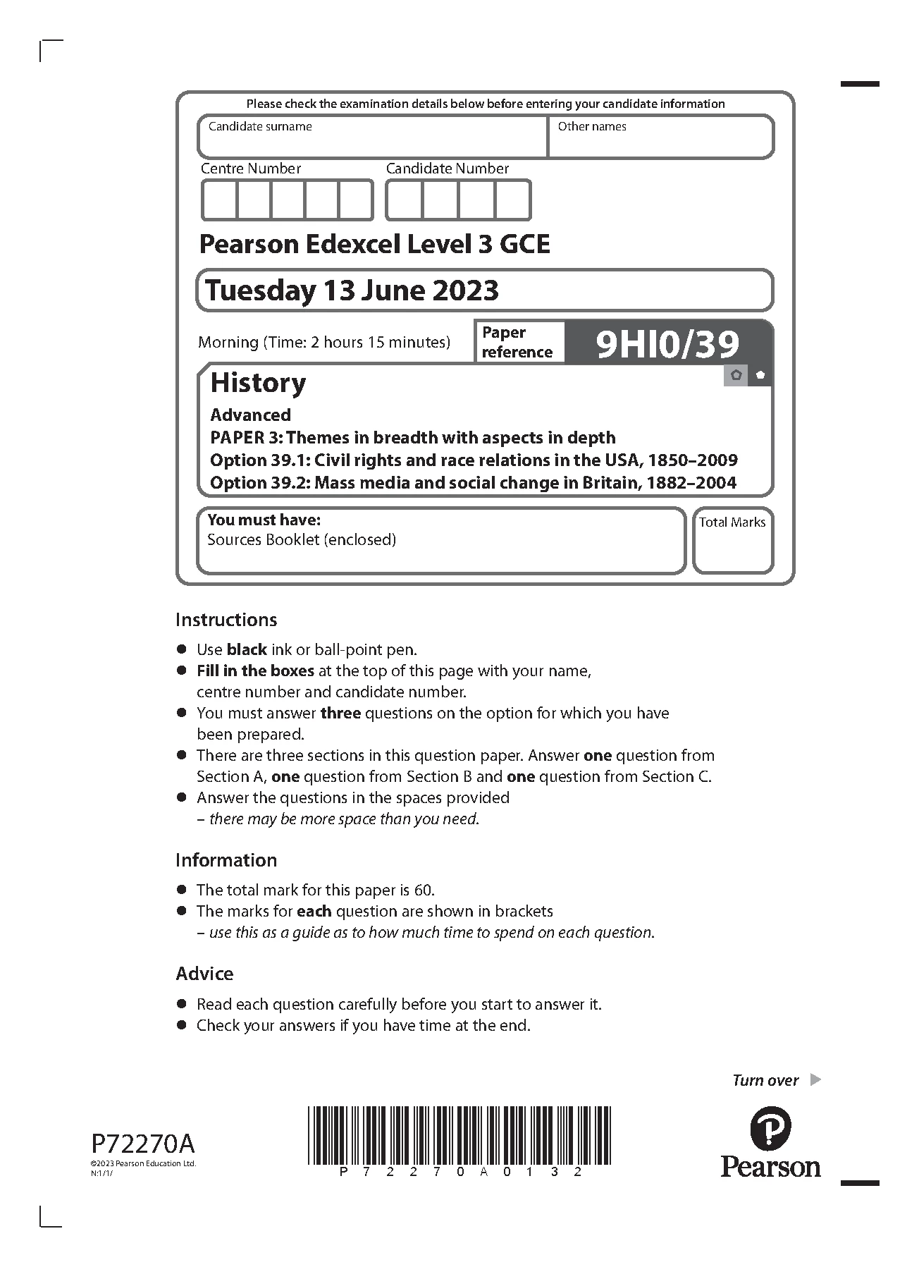 PEARSON EDEXCEL A LEVEL History PAPER 3 2023 QUESTION PAPER (9HI0/39: Option 39.1: Civil rights and race relations in the USA, 1850–2009 & Option 39.2: Mass media and social change in Britain, 1882–2004). PEARSON EDEXCEL A LEVEL History PAPER 3 2023 QUESTION PAPER (9HI0/39: Option 39.1: Civil rights and race relations in the USA, 1850–2009 & Option 39.2: Mass media and social change in Britain, 1882–2004) Pearson Edexcel A and AS Papers and Mark Schemes