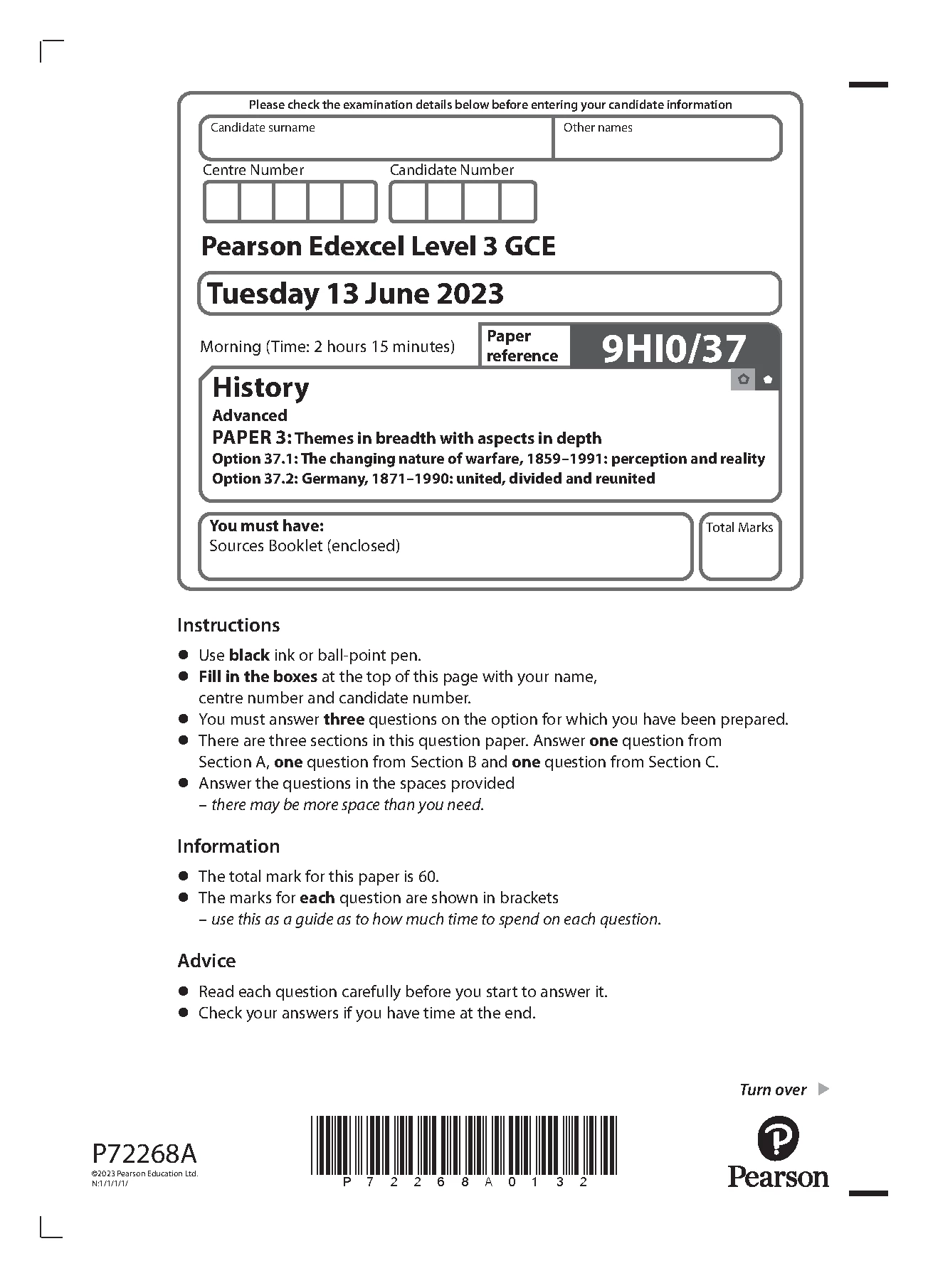 PEARSON EDEXCEL A LEVEL History PAPER 3 2023 QUESTION PAPER (9HI0/37: Option 37.1: The changing nature of warfare, 1859–1991: perception and reality & Option 37.2: Germany, 1871–1990: united, divided and reunited). PEARSON EDEXCEL A LEVEL History PAPER 3 2023 QUESTION PAPER (9HI0/37: Option 37.1: The changing nature of warfare, 1859–1991: perception and reality & Option 37.2: Germany, 1871–1990: united, divided and reunited) Pearson Edexcel A and AS Papers and Mark Schemes