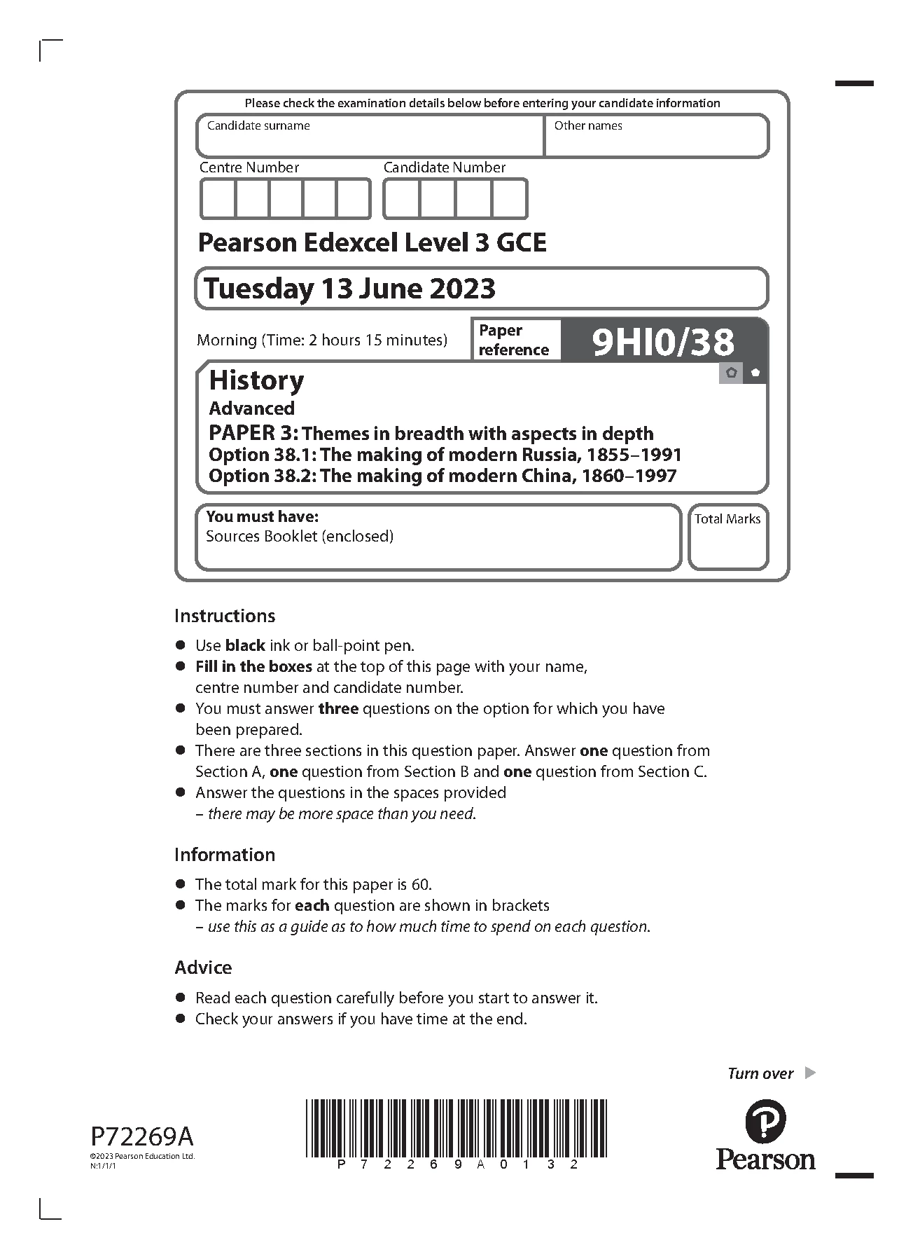 PEARSON EDEXCEL A LEVEL History PAPER 3 2023 QUESTION PAPER (9HI0/38: Option 38.1: The making of modern Russia, 1855–1991 & Option 38.2: The making of modern China, 1860–1997). PEARSON EDEXCEL A LEVEL History PAPER 3 2023 QUESTION PAPER (9HI0/38: Option 38.1: The making of modern Russia, 1855–1991 & Option 38.2: The making of modern China, 1860–1997) Pearson Edexcel A and AS Papers and Mark Schemes