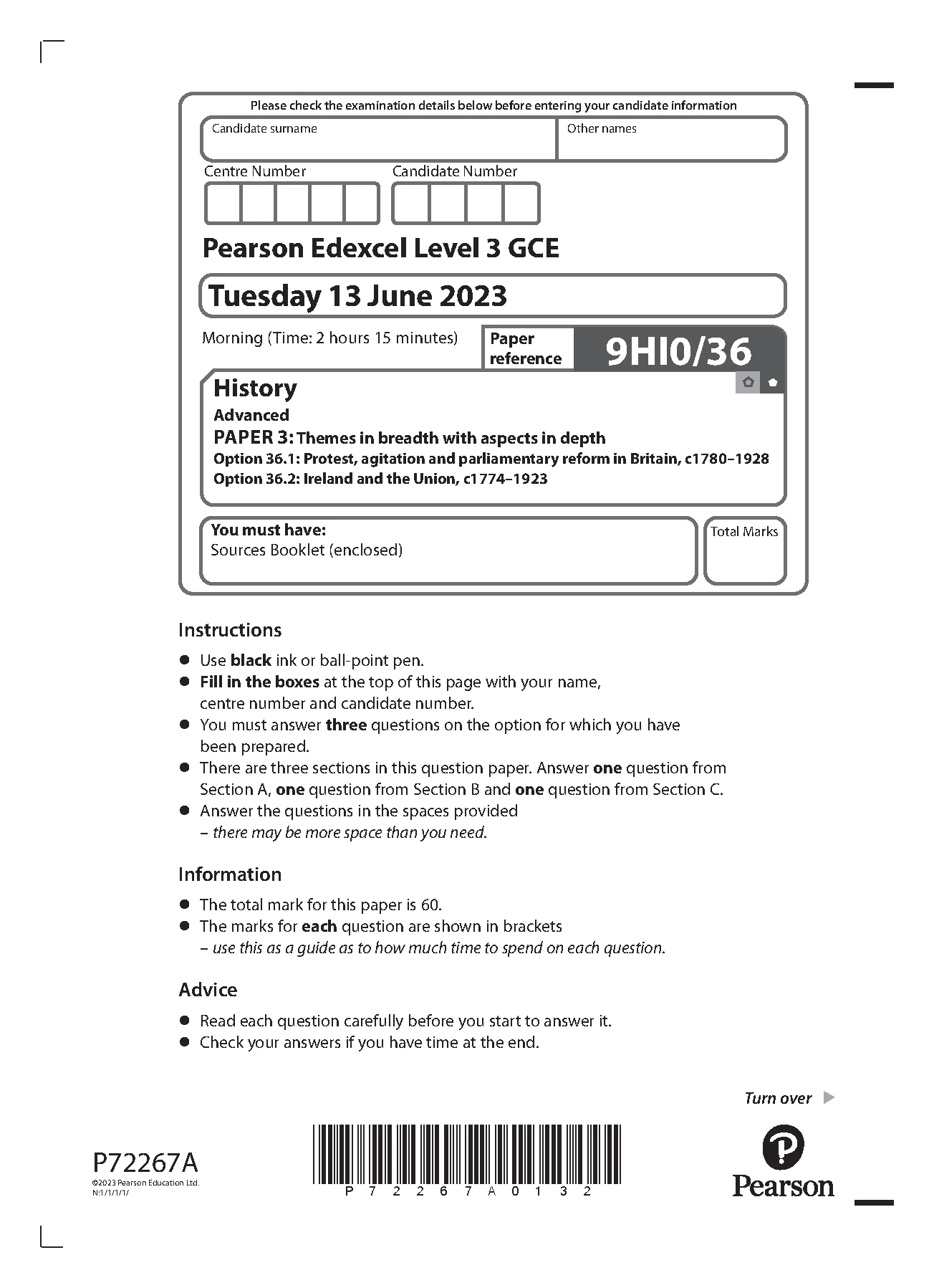 PEARSON EDEXCEL A LEVEL History PAPER 3 2023 QUESTION PAPER (9HI0/36: Option 36.1: Protest, agitation and parliamentary reform in Britain, c1780–1928 & Option 36.2: Ireland and the Union, c1774–1923). PEARSON EDEXCEL A LEVEL History PAPER 3 2023 QUESTION PAPER (9HI0/36: Option 36.1: Protest, agitation and parliamentary reform in Britain, c1780–1928 & Option 36.2: Ireland and the Union, c1774–1923) Pearson Edexcel A and AS Papers and Mark Schemes