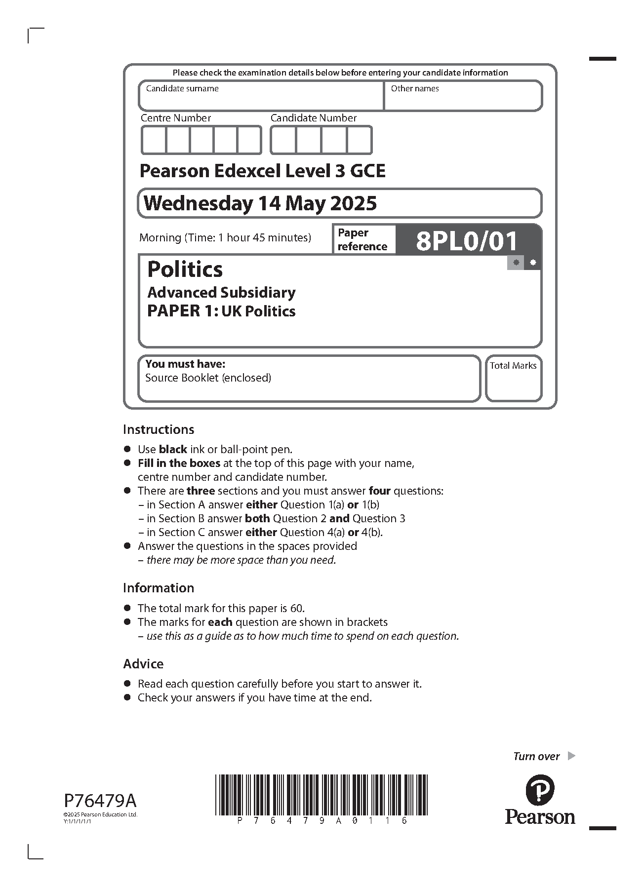 2025 Pearson Edexcel AS Level Politics Paper 1 and Mark Scheme Combined (8PL0/01: UK Politics). 2025 Pearson Edexcel AS Level Politics Paper 1 and Mark Scheme Combined (8PL0/01: UK Politics) Pearson Edexcel A and AS Papers and Mark Schemes