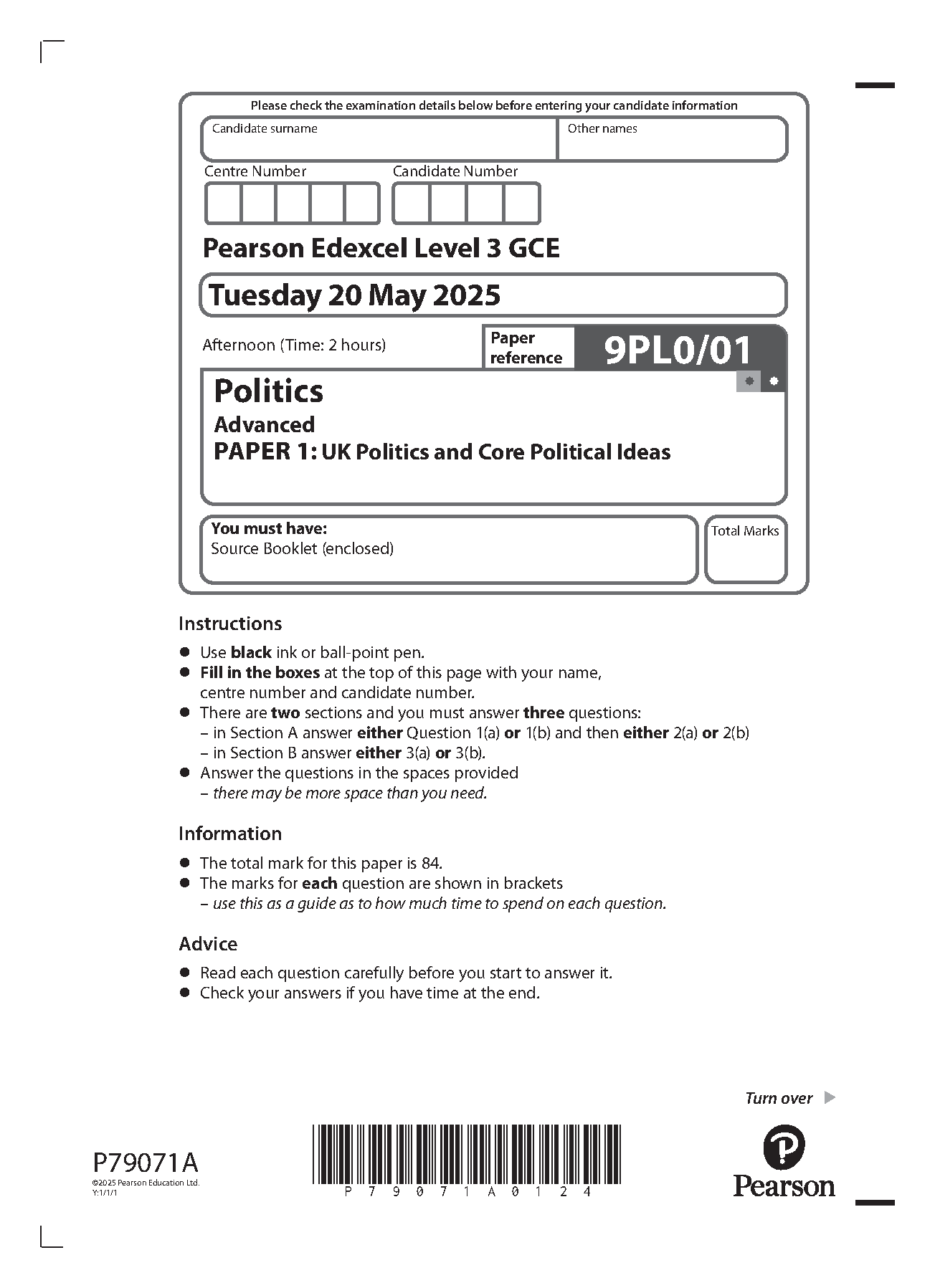2025 Pearson Edexcel A Level Politics Paper 1 and Mark Scheme Combined (9PL0/01: UK Politics and Core Political Ideas). 2025 Pearson Edexcel A Level Politics Paper 1 and Mark Scheme Combined (9PL0/01: UK Politics and Core Political Ideas) Pearson Edexcel A and AS Papers and Mark Schemes