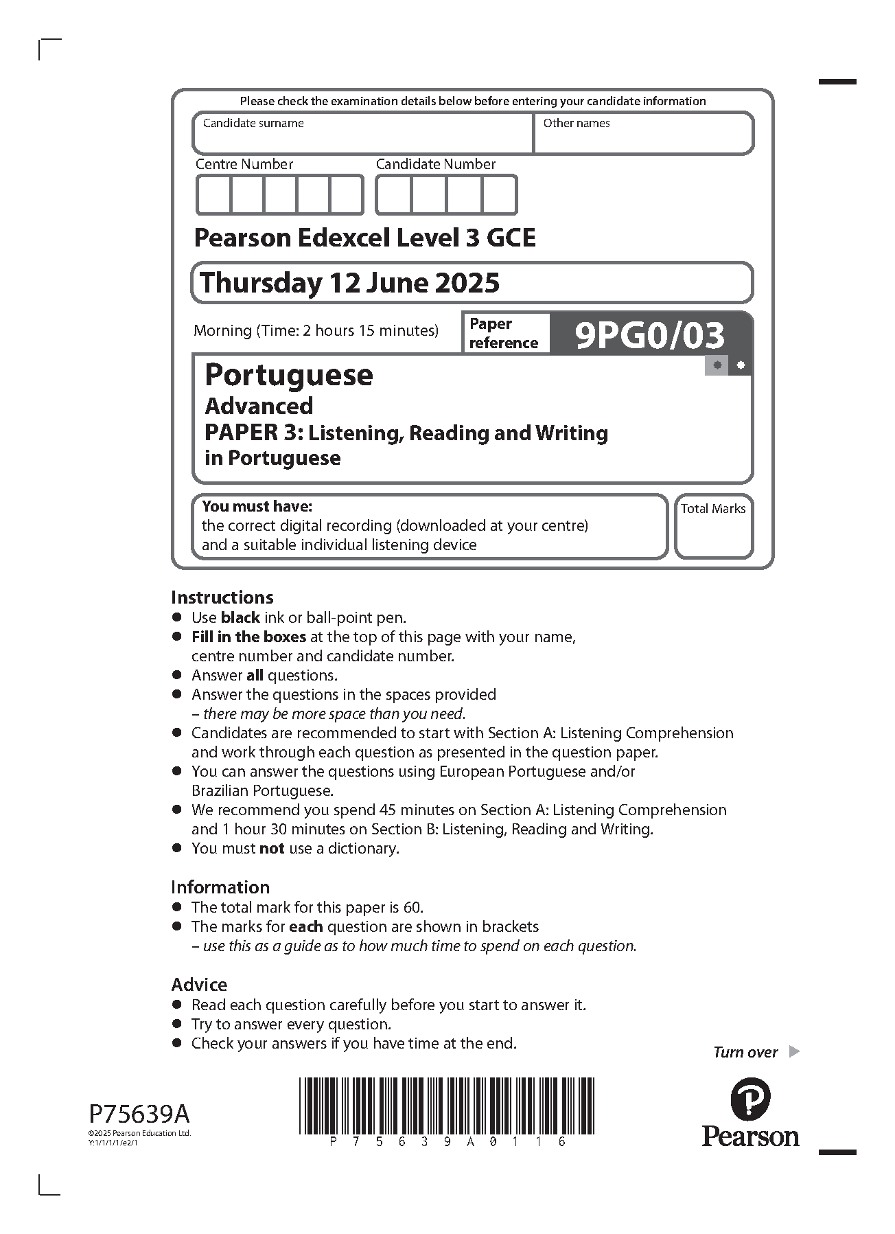 2025 Pearson Edexcel A Level Portuguese PAPER 3 and Mark Scheme Combined (9PG0/03: Listening, Reading and Writing in Portuguese). 2025 Pearson Edexcel A Level Portuguese PAPER 3 and Mark Scheme Combined (9PG0/03: Listening, Reading and Writing in Portuguese) Pearson Edexcel A and AS Papers and Mark Schemes