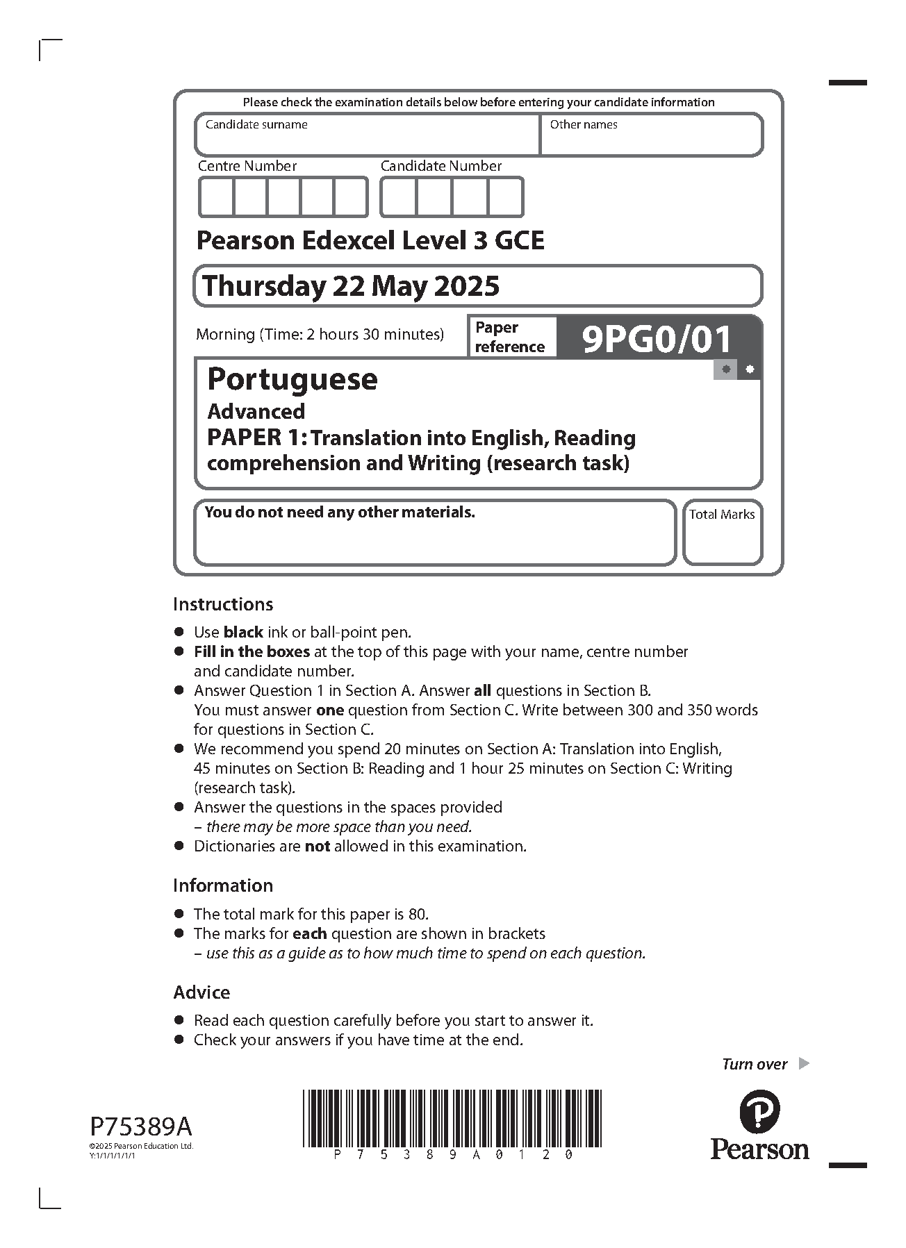 2025 Pearson Edexcel A Level Portuguese PAPER 1 and Mark Scheme Combined (9PG0/01: Translation into English, Reading comprehension and Writing (research task)). 2025 Pearson Edexcel A Level Portuguese PAPER 1 and Mark Scheme Combined (9PG0/01: Translation into English, Reading comprehension and Writing (research task)) Pearson Edexcel A and AS Papers and Mark Schemes