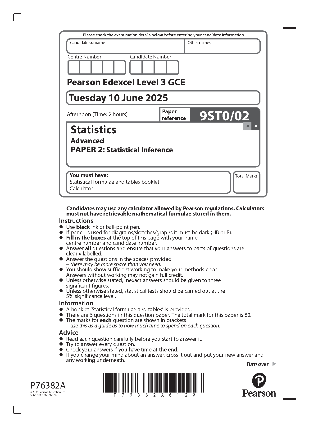 2025 Pearson Edexcel A Level Statistics PAPER 2 and Mark Scheme Combined (9ST0/02: Statistical Inference). 2025 Pearson Edexcel A Level Statistics PAPER 2 and Mark Scheme Combined (9ST0/02: Statistical Inference) Pearson Edexcel A and AS Papers and Mark Schemes