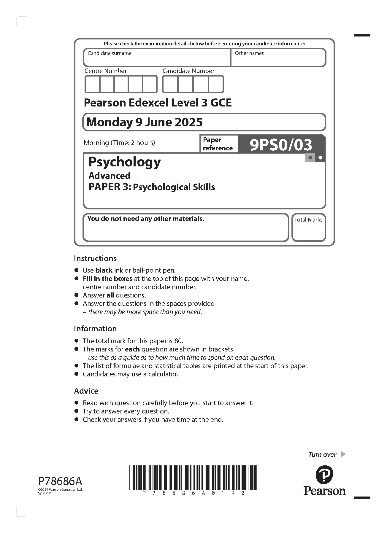 2025 Pearson Edexcel A Level Psychology PAPER 3 and Mark Scheme Combined (9PS0/03: Psychological Skills). 2025 Pearson Edexcel A Level Psychology PAPER 3 and Mark Scheme Combined (9PS0/03: Psychological Skills) Pearson Edexcel A and AS Papers and Mark Schemes
