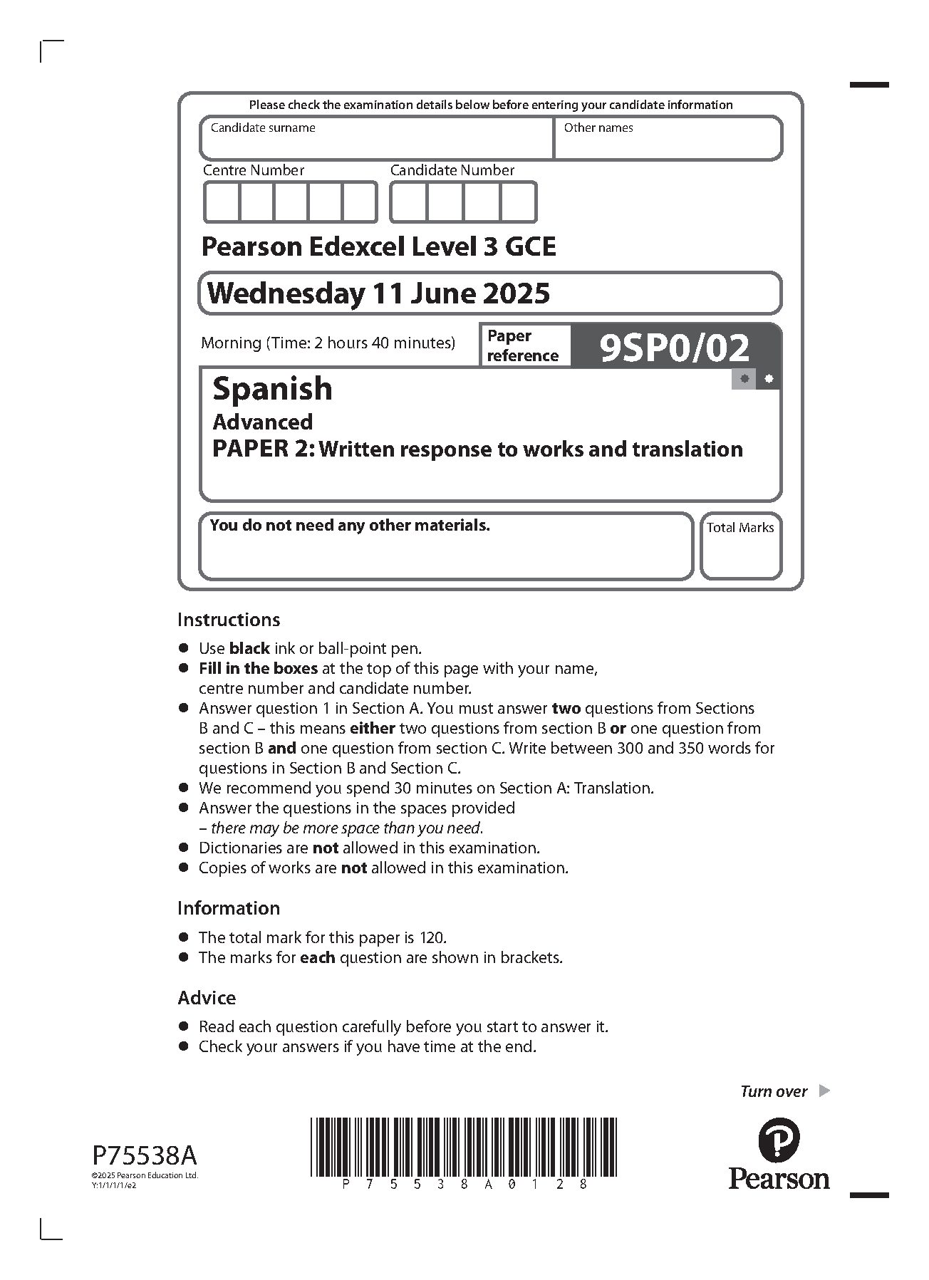 2025 Pearson Edexcel A Level Spanish PAPER 2 and Mark Scheme Combined (9SP0/02: Written response to works and translation). 2025 Pearson Edexcel A Level Spanish PAPER 2 and Mark Scheme Combined (9SP0/02: Written response to works and translation) Pearson Edexcel A and AS Papers and Mark Schemes