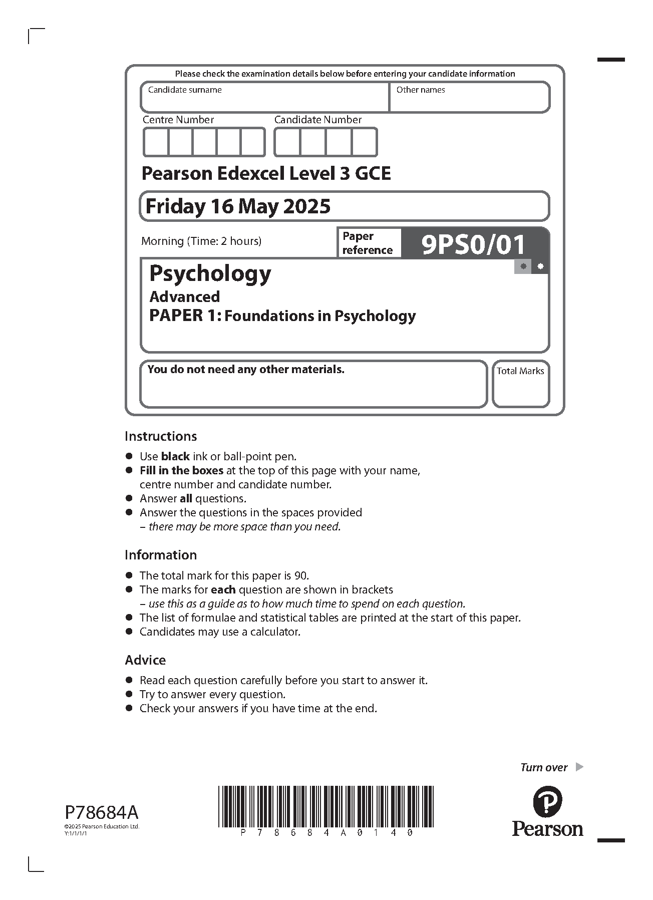 2025 Pearson Edexcel A Level Psychology PAPER 1 and Mark Scheme Combined (9PS0/01: Foundations in Psychology). 2025 Pearson Edexcel A Level Psychology PAPER 1 and Mark Scheme Combined (9PS0/01: Foundations in Psychology) Pearson Edexcel A and AS Papers and Mark Schemes