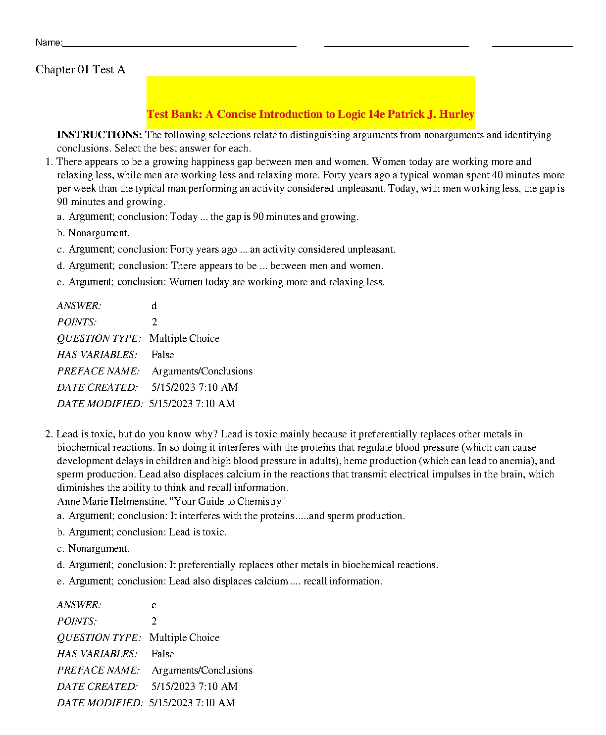 Test Bank: A Concise Introduction to Logic 14th Edition by Patrick J. Hurley - 2024/2025 Exam Success Guide. Test Bank: A Concise Introduction to Logic 14th Edition by Patrick J. Hurley - 2024/2025 Exam Success Guide TEST BANKS
