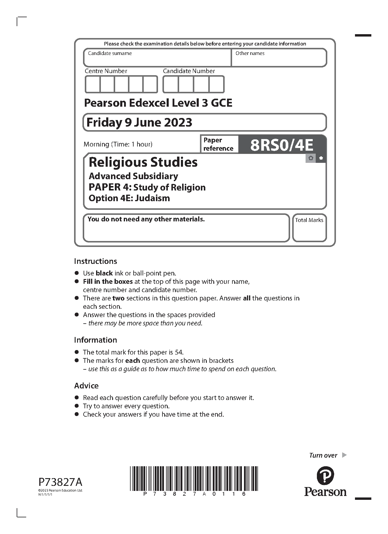 PEARSON EDEXCEL AS LEVEL Religious Studies PAPER 4 2023 QUESTION PAPER (8RS0/4E: Study of Religion - Judaism). PEARSON EDEXCEL AS LEVEL Religious Studies PAPER 4 2023 QUESTION PAPER (8RS0/4E: Study of Religion - Judaism) Pearson Edexcel A and AS Papers and Mark Schemes