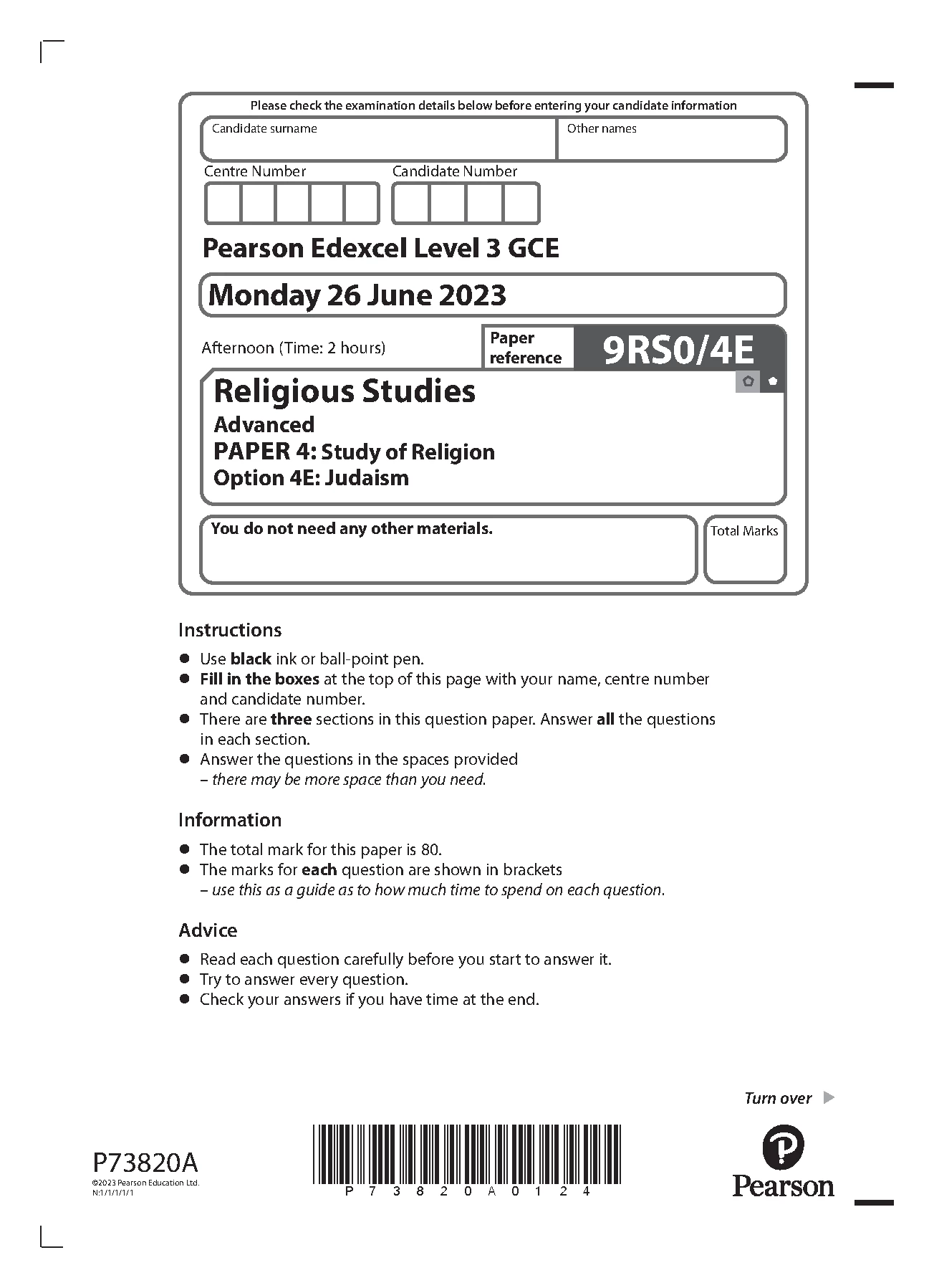 pearson edexcel a level religious studies paper 4 2023 question paper (9rs0/4e: judaism). download official and verified...