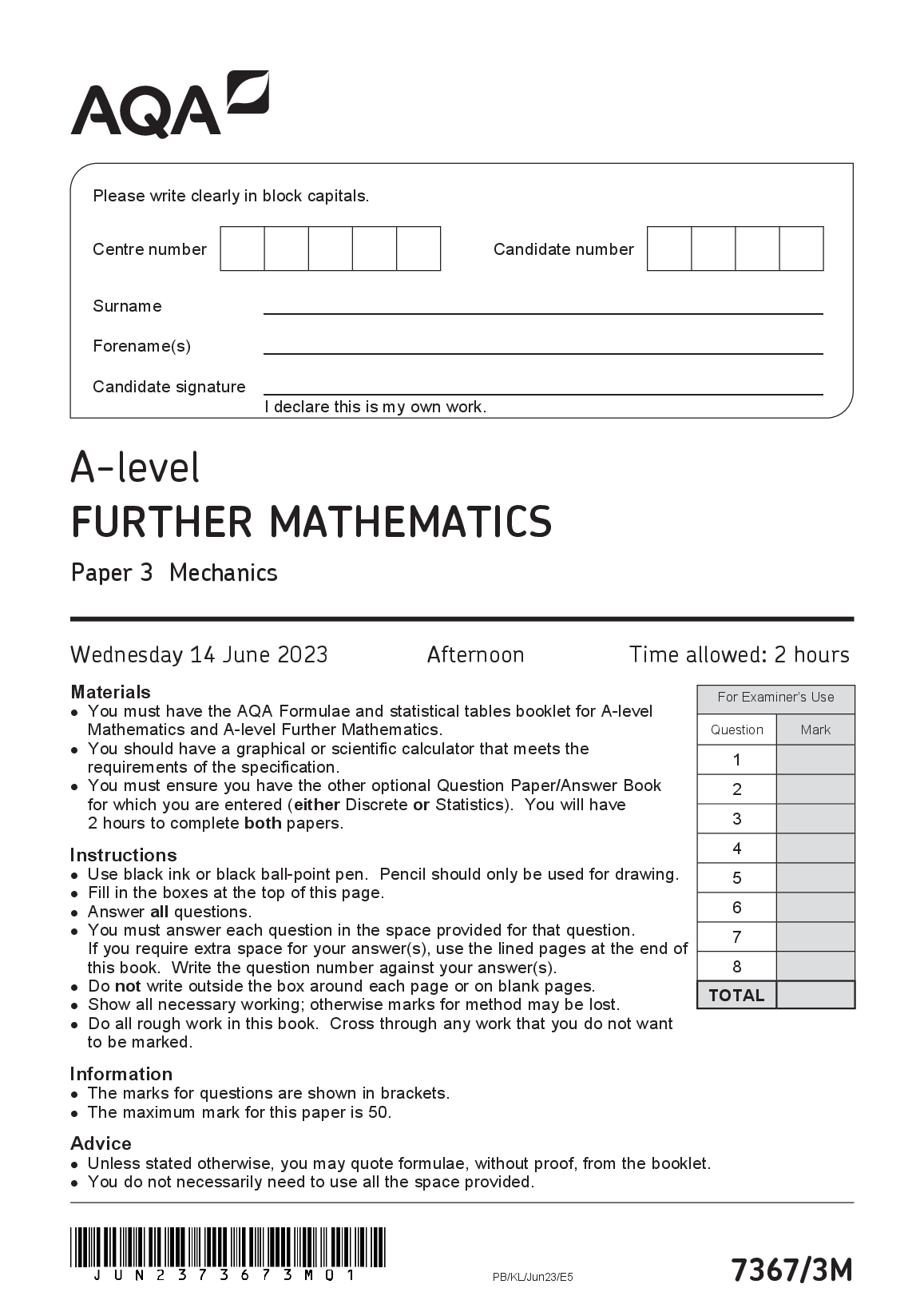aqa a level further mathematics paper 3 mark scheme 2023 (7367/3m: mechanics). download official and verified aqa a leve...