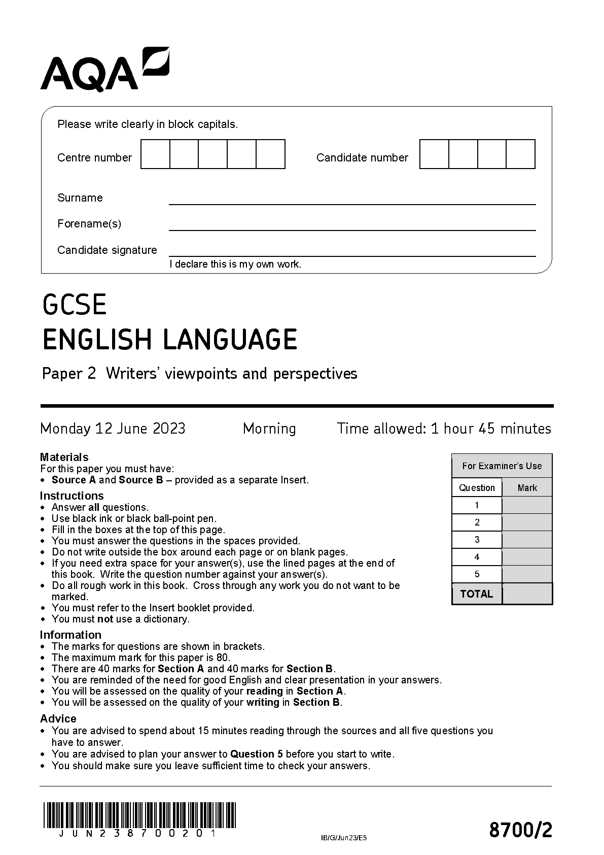 2023 AQA GCSE ENGLISH LANGUAGE QUESTION PAPER 2 (8132/2: Writers’ viewpoints and perspectives). 2023 AQA GCSE ENGLISH LANGUAGE QUESTION PAPER 2 (8132/2: Writers’ viewpoints and perspectives) AQA papers mark schemes