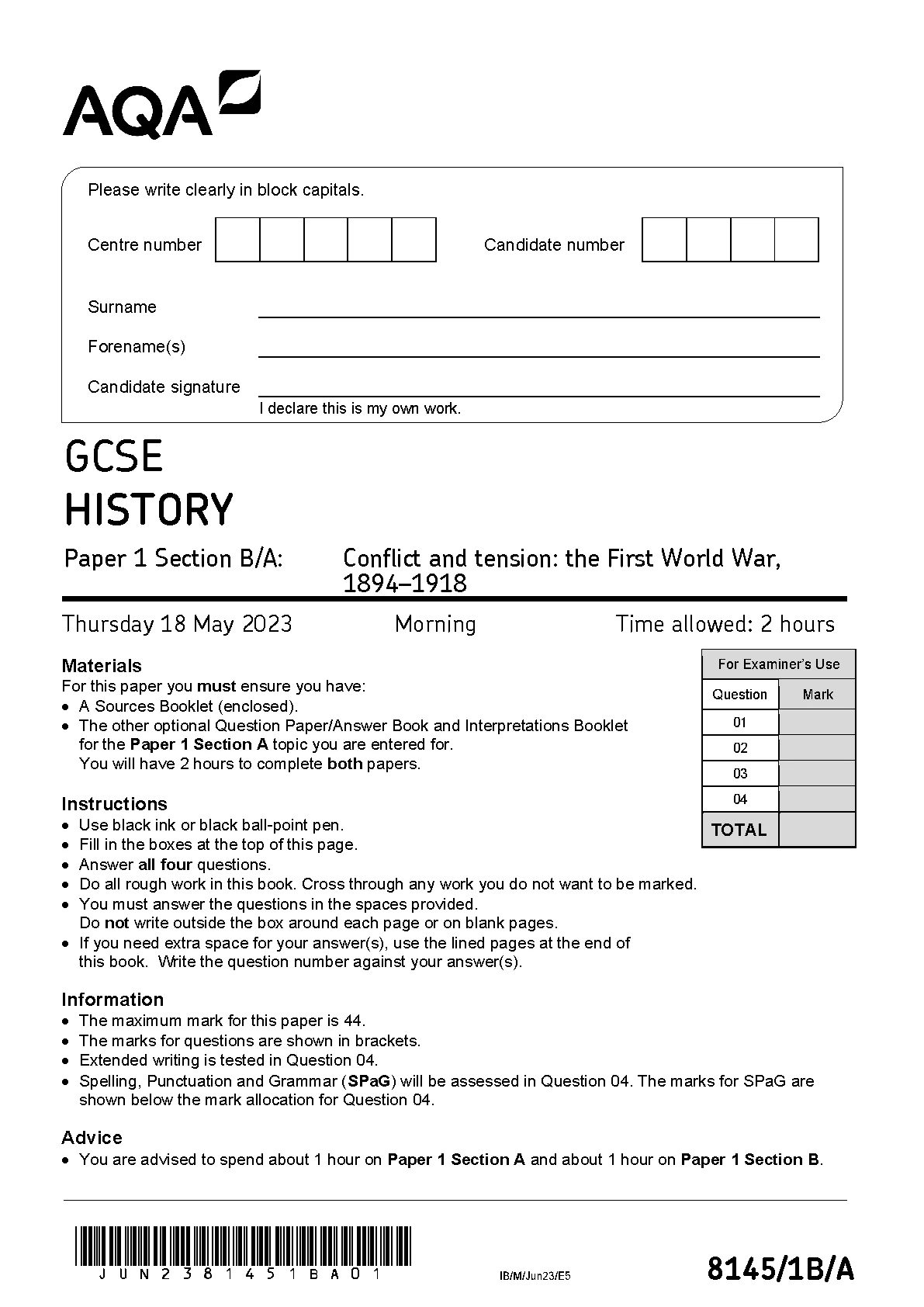 AQA GCSE HISTORY PAPER 1 QUESTION PAPER 2023 (8145/1B/A: Conflict and tension: the First World War, 1894–1918). AQA GCSE HISTORY PAPER 1 QUESTION PAPER 2023 (8145/1B/A: Conflict and tension: the First World War, 1894–1918) AQA papers mark schemes