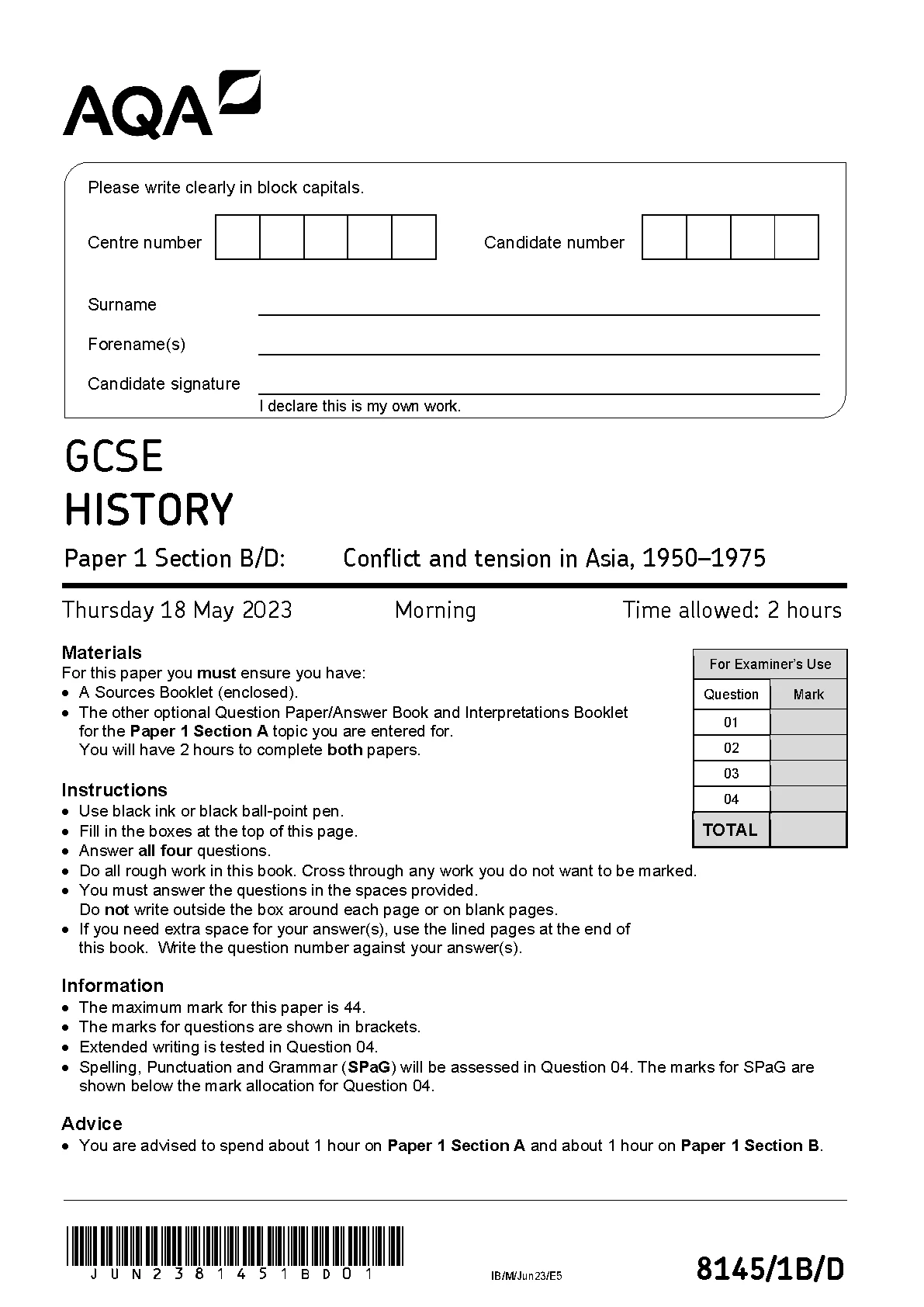 AQA GCSE HISTORY PAPER 1 QUESTION PAPER 2023 (8145/1B/D: Conflict and tension in Asia, 1950–1975). AQA GCSE HISTORY PAPER 1 QUESTION PAPER 2023 (8145/1B/D: Conflict and tension in Asia, 1950–1975) AQA papers mark schemes