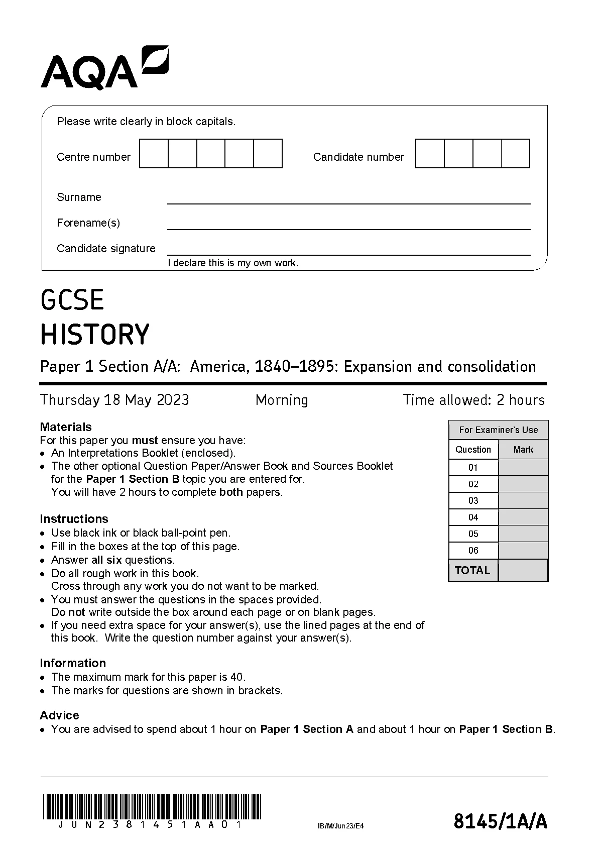 AQA GCSE HISTORY PAPER 1 QUESTION PAPER 2023 (8145/1A/A: Section A/A: America, 1840–1895: Expansion and consolidation). AQA GCSE HISTORY PAPER 1 QUESTION PAPER 2023 (8145/1A/A: Section A/A: America, 1840–1895: Expansion and consolidation) AQA papers mark schemes