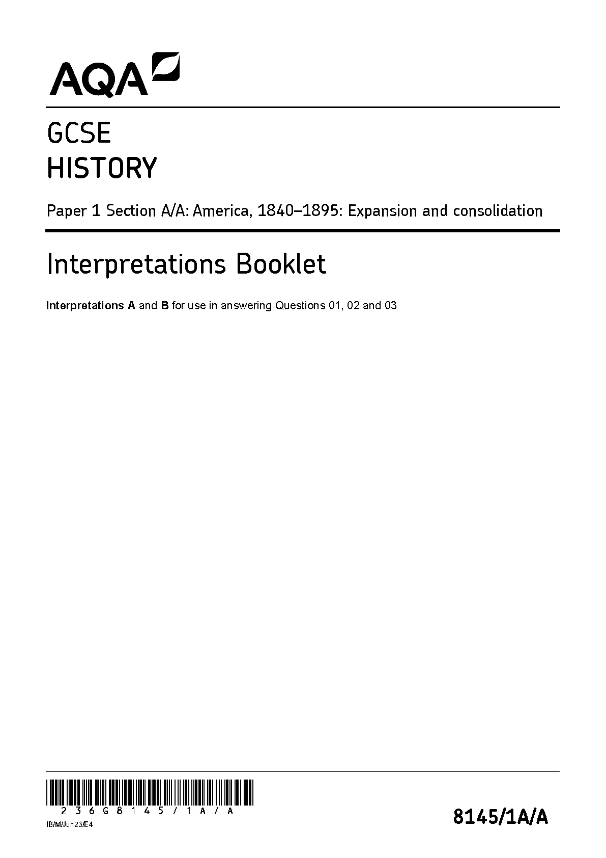 AQA GCSE HISTORY PAPER 1 Interpretations Booklet 2023 (8145/1A/A: America, 1840–1895: Expansion and consolidation). AQA GCSE HISTORY PAPER 1 Interpretations Booklet 2023 (8145/1A/A: America, 1840–1895: Expansion and consolidation) AQA papers mark schemes