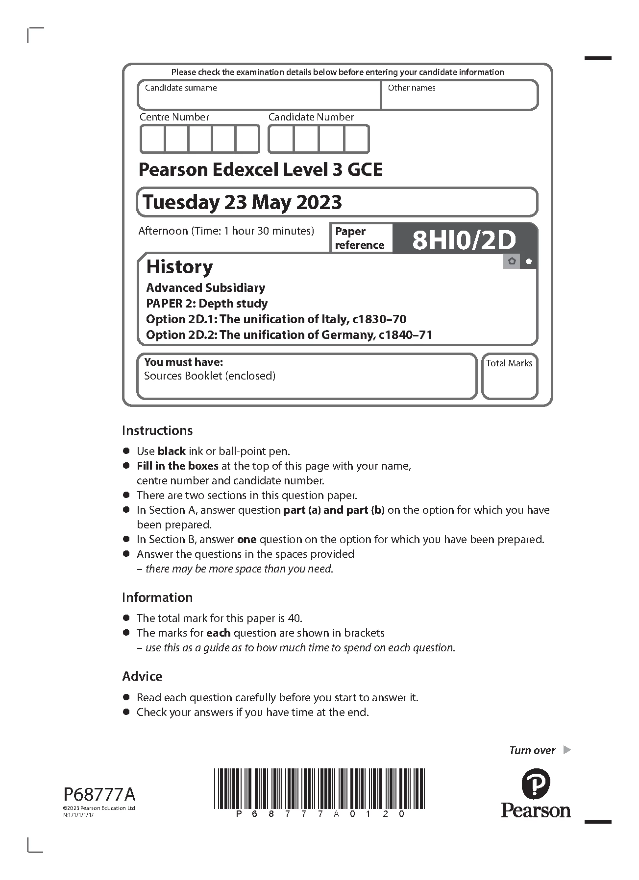 PEARSON EDEXCEL AS LEVEL History PAPER 2 2023 QUESTION PAPER (8HI0/2D: Option 2D.1: The unification of Italy, c1830–70 & Option 2D.2: The unification of Germany, c1840–71). PEARSON EDEXCEL AS LEVEL History PAPER 2 2023 QUESTION PAPER (8HI0/2D: Option 2D.1: The unification of Italy, c1830–70 & Option 2D.2: The unification of Germany, c1840–71) Pearson Edexcel A and AS Papers and Mark Schemes
