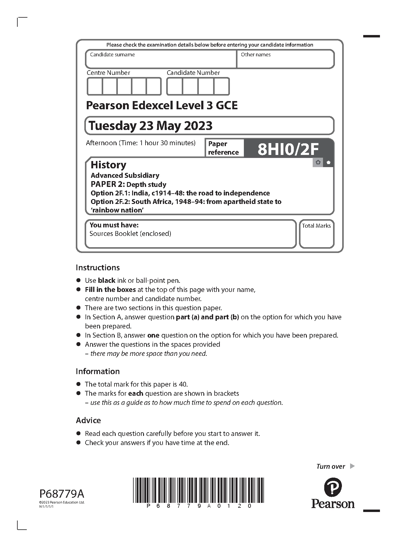 PEARSON EDEXCEL AS LEVEL History PAPER 2 2023 QUESTION PAPER (8HI0/2F: Option 2F.1: India, c1914–48: the road to independence & Option 2F.2: South Africa, 1948–94: from apartheid state to ‘rainbow nation’). PEARSON EDEXCEL AS LEVEL History PAPER 2 2023 QUESTION PAPER (8HI0/2F: Option 2F.1: India, c1914–48: the road to independence & Option 2F.2: South Africa, 1948–94: from apartheid state to ‘rainbow nation’) Pearson Edexcel A and AS Papers and Mark Schemes