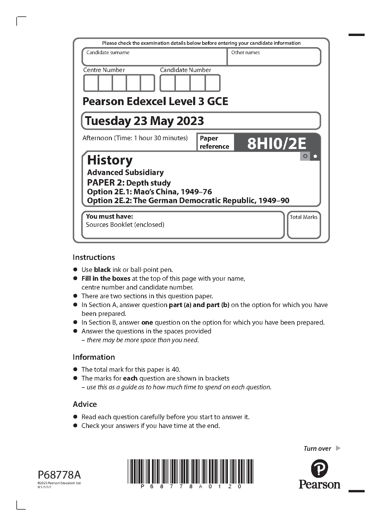 PEARSON EDEXCEL AS LEVEL History PAPER 2 2023 QUESTION PAPER (8HI0/2E: Option 2E.1: Mao’s China, 1949–76 & Option 2E.2: The German Democratic Republic, 1949–90). PEARSON EDEXCEL AS LEVEL History PAPER 2 2023 QUESTION PAPER (8HI0/2E: Option 2E.1: Mao’s China, 1949–76 & Option 2E.2: The German Democratic Republic, 1949–90) Pearson Edexcel A and AS Papers and Mark Schemes