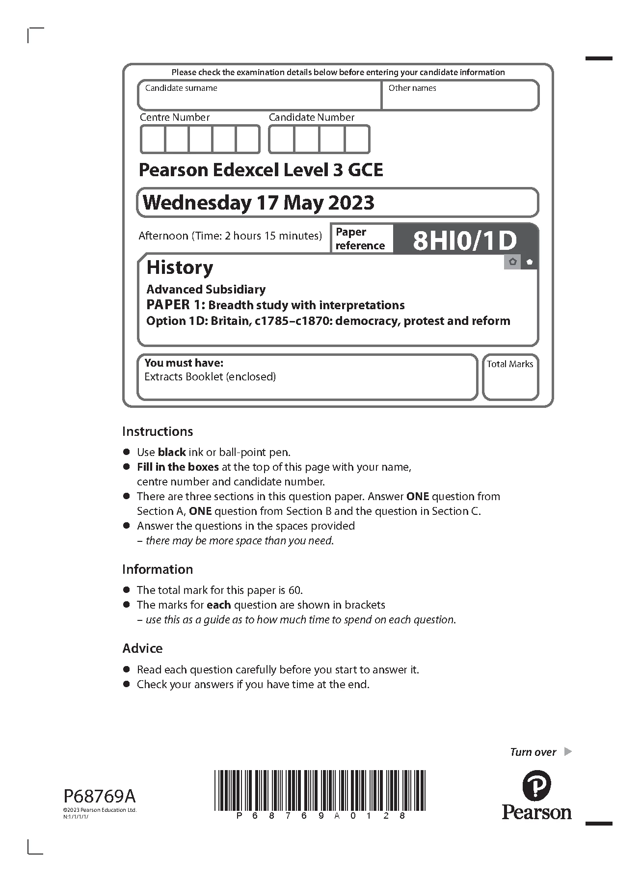 PEARSON EDEXCEL AS LEVEL History PAPER 1 2023 QUESTION PAPER (8HI0/1D: Breadth study with interpretations - Britain, c1785–c1870: democracy, protest and reform). PEARSON EDEXCEL AS LEVEL History PAPER 1 2023 QUESTION PAPER (8HI0/1D: Breadth study with interpretations - Britain, c1785–c1870: democracy, protest and reform) Pearson Edexcel A and AS Papers and Mark Schemes