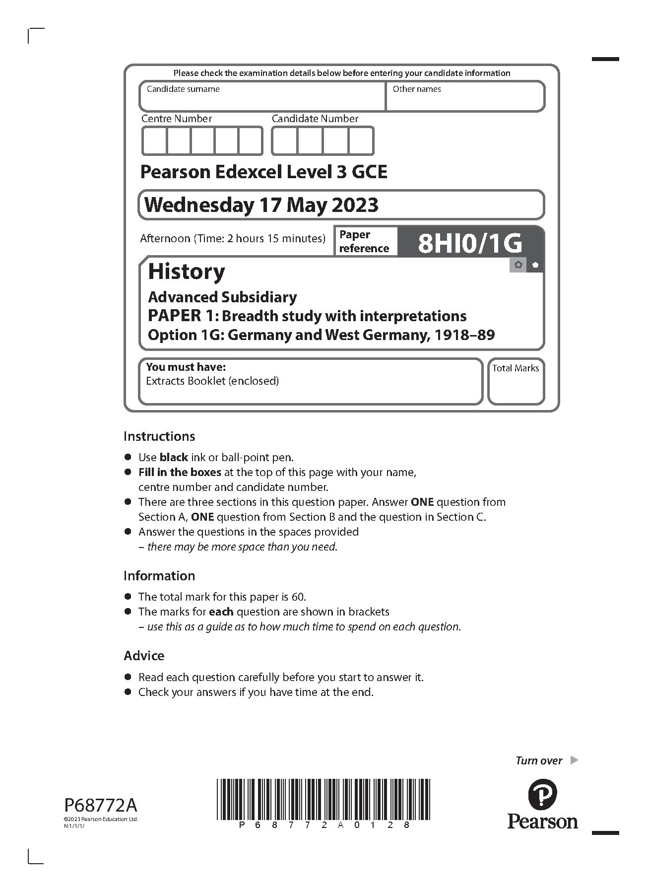 PEARSON EDEXCEL AS LEVEL History PAPER 1 2023 QUESTION PAPER (8HI0/1G: Breadth study with interpretations - Germany and West Germany, 1918–89). PEARSON EDEXCEL AS LEVEL History PAPER 1 2023 QUESTION PAPER (8HI0/1G: Breadth study with interpretations - Germany and West Germany, 1918–89) Pearson Edexcel A and AS Papers and Mark Schemes