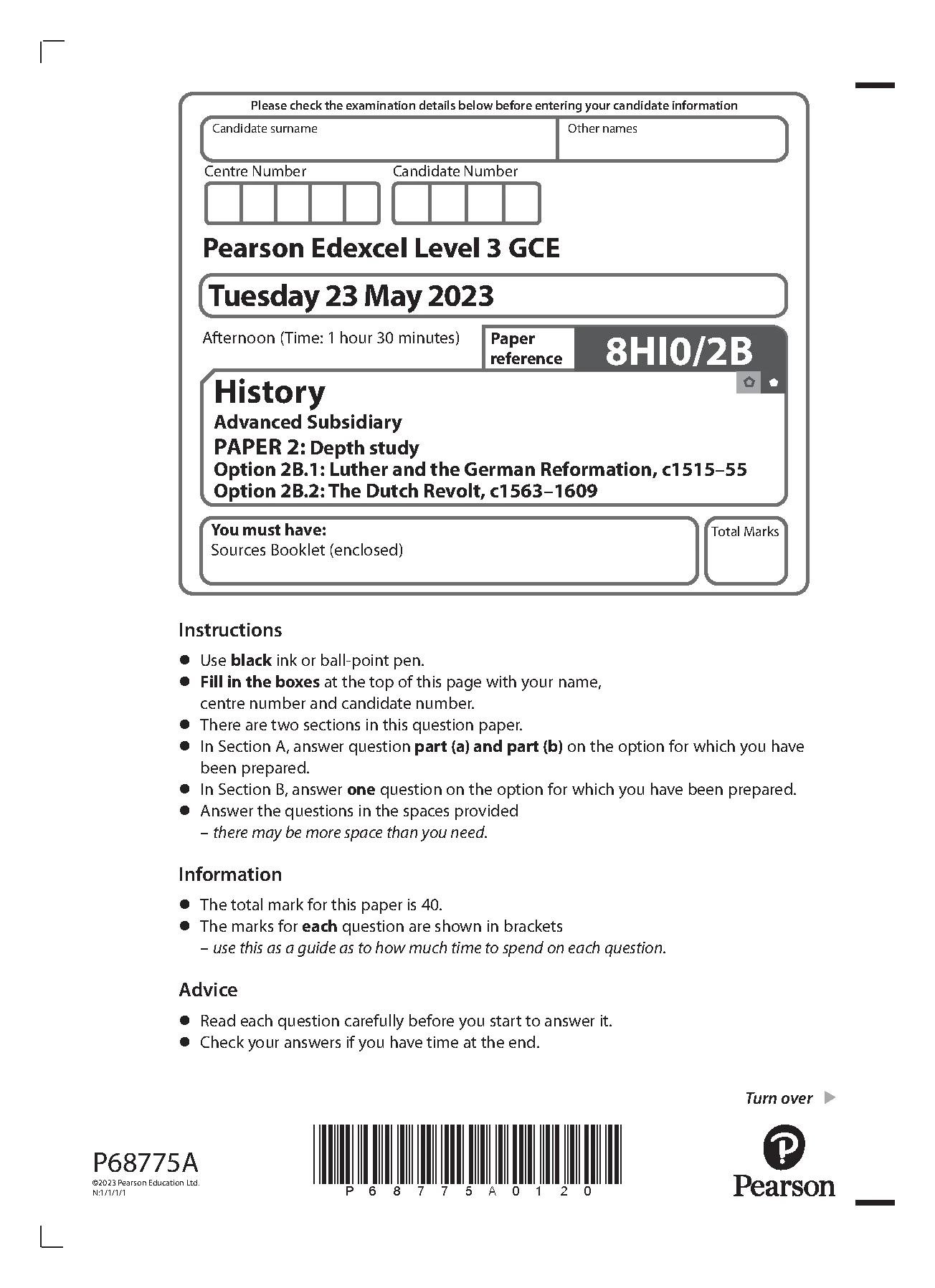 PEARSON EDEXCEL AS LEVEL History PAPER 2 2023 QUESTION PAPER (8HI0/2B: Option 2B.1: Luther and the German Reformation, c1515–55 & Option 2B.2: The Dutch Revolt, c1563–1609). PEARSON EDEXCEL AS LEVEL History PAPER 2 2023 QUESTION PAPER (8HI0/2B: Option 2B.1: Luther and the German Reformation, c1515–55 & Option 2B.2: The Dutch Revolt, c1563–1609) Pearson Edexcel A and AS Papers and Mark Schemes