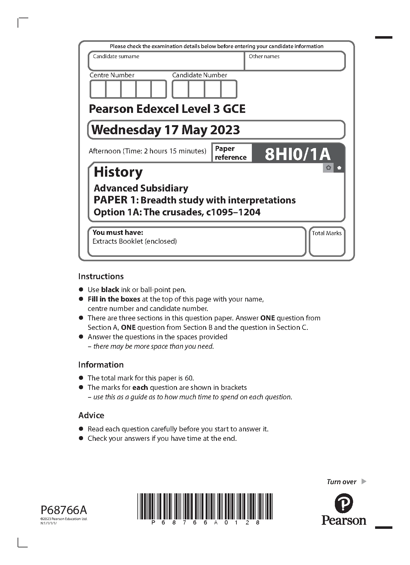 PEARSON EDEXCEL AS LEVEL History PAPER 1 2023 QUESTION PAPER (8HI0/1A: Breadth study with interpretations - The crusades, c1095–1204). PEARSON EDEXCEL AS LEVEL History PAPER 1 2023 QUESTION PAPER (8HI0/1A: Breadth study with interpretations - The crusades, c1095–1204) Pearson Edexcel A and AS Papers and Mark Schemes