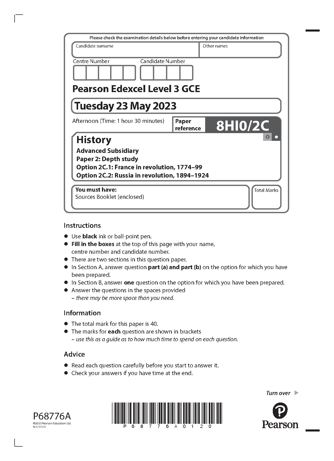 PEARSON EDEXCEL AS LEVEL History PAPER 2 2023 QUESTION PAPER (8HI0/2C: Option 2C.1: France in revolution, 1774–99 & Option 2C.2: Russia in revolution, 1894–1924). PEARSON EDEXCEL AS LEVEL History PAPER 2 2023 QUESTION PAPER (8HI0/2C: Option 2C.1: France in revolution, 1774–99 & Option 2C.2: Russia in revolution, 1894–1924) Pearson Edexcel A and AS Papers and Mark Schemes