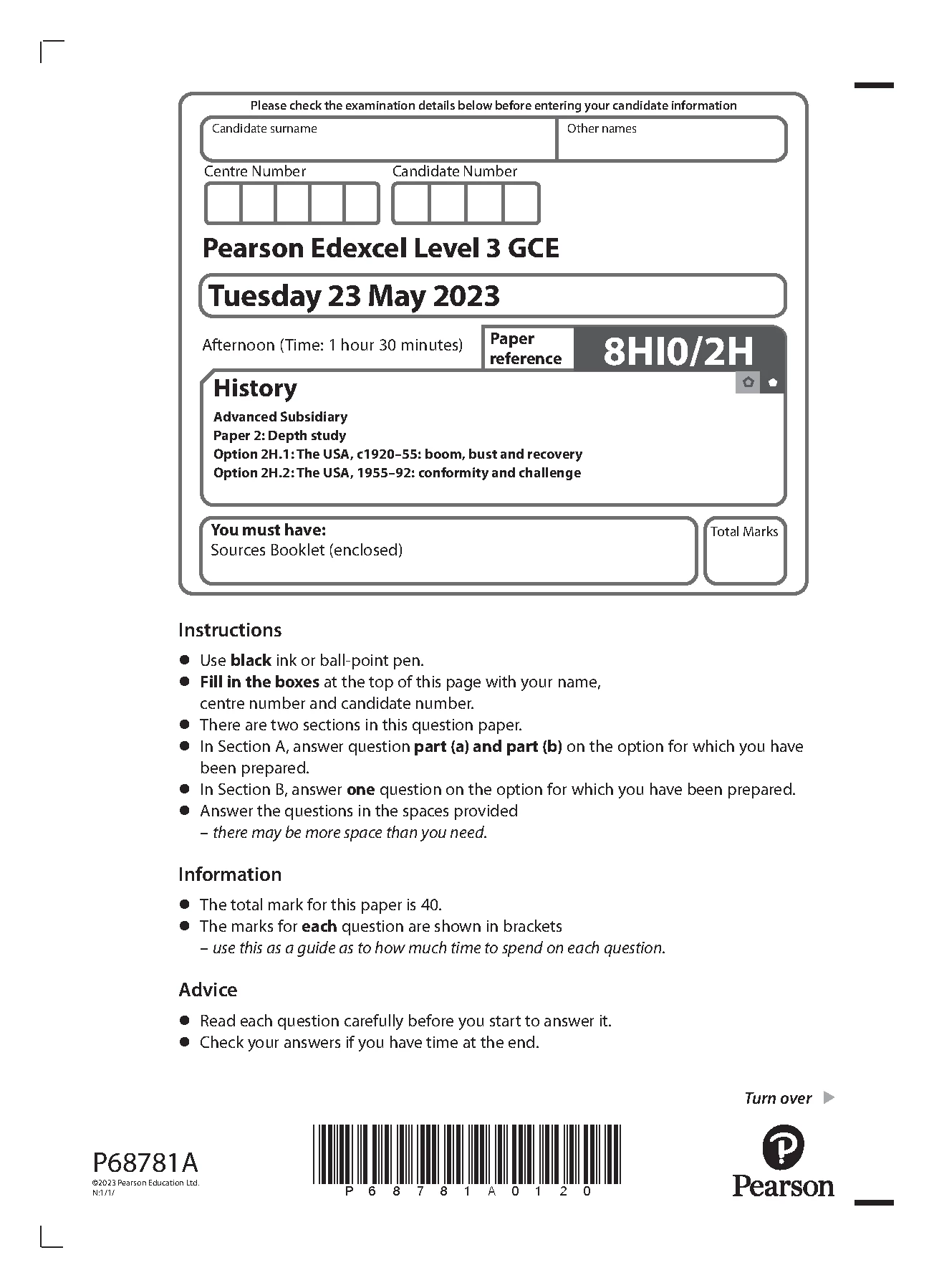 PEARSON EDEXCEL AS LEVEL History PAPER 2 2023 QUESTION PAPER (8HI0/2H: Option 2H.1: The USA, c1920–55: boom, bust and recovery & Option 2H.2: The USA, 1955–92: conformity and challenge). PEARSON EDEXCEL AS LEVEL History PAPER 2 2023 QUESTION PAPER (8HI0/2H: Option 2H.1: The USA, c1920–55: boom, bust and recovery & Option 2H.2: The USA, 1955–92: conformity and challenge) Pearson Edexcel A and AS Papers and Mark Schemes