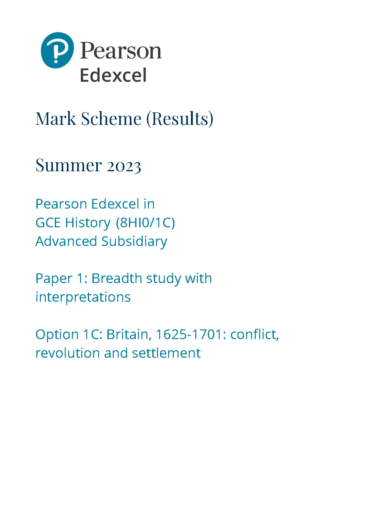 PEARSON EDEXCEL AS LEVEL History PAPER 1 2023 MARK SCHEME (8HI0/1C: Britain, 1625-1701: conflict, revolution and settlement). PEARSON EDEXCEL AS LEVEL History PAPER 1 2023 MARK SCHEME (8HI0/1C: Britain, 1625-1701: conflict, revolution and settlement) Pearson Edexcel A and AS Papers and Mark Schemes