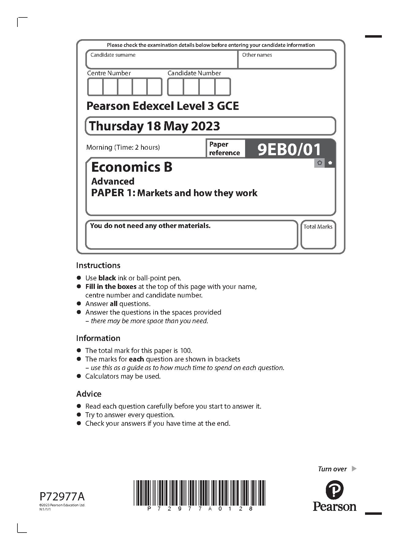 PEARSON EDEXCEL A LEVEL ECONOMICS B QUESTION PAPER 1 2023 (9EB0/01:Markets and how they work). PEARSON EDEXCEL A LEVEL ECONOMICS B QUESTION PAPER 1 2023 (9EB0/01:Markets and how they work) Pearson Edexcel A and AS Papers and Mark Schemes