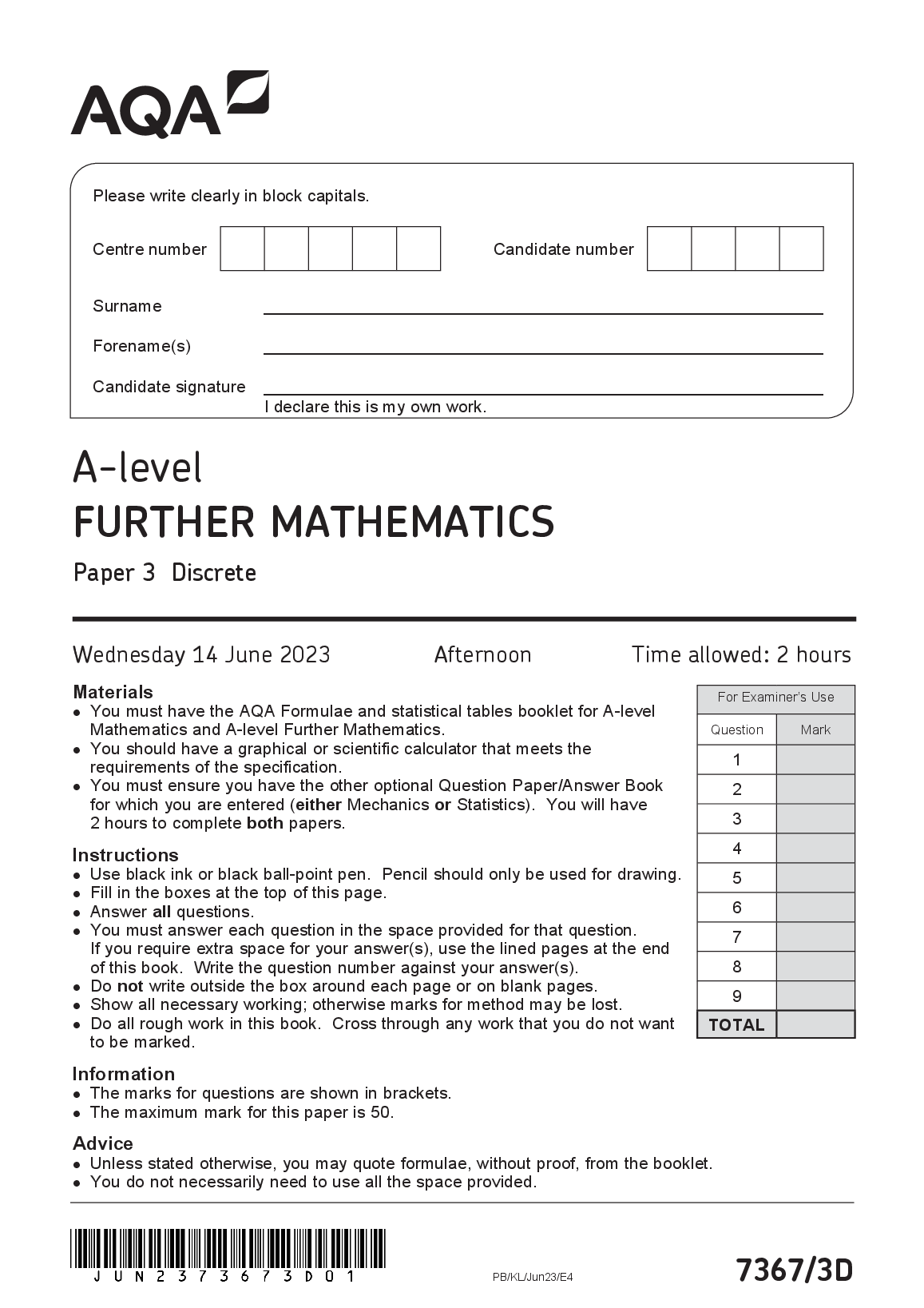 aqa a level further mathematics paper 3 mark scheme 2023 (7367/3d: discrete). download official and verified aqa a level...
