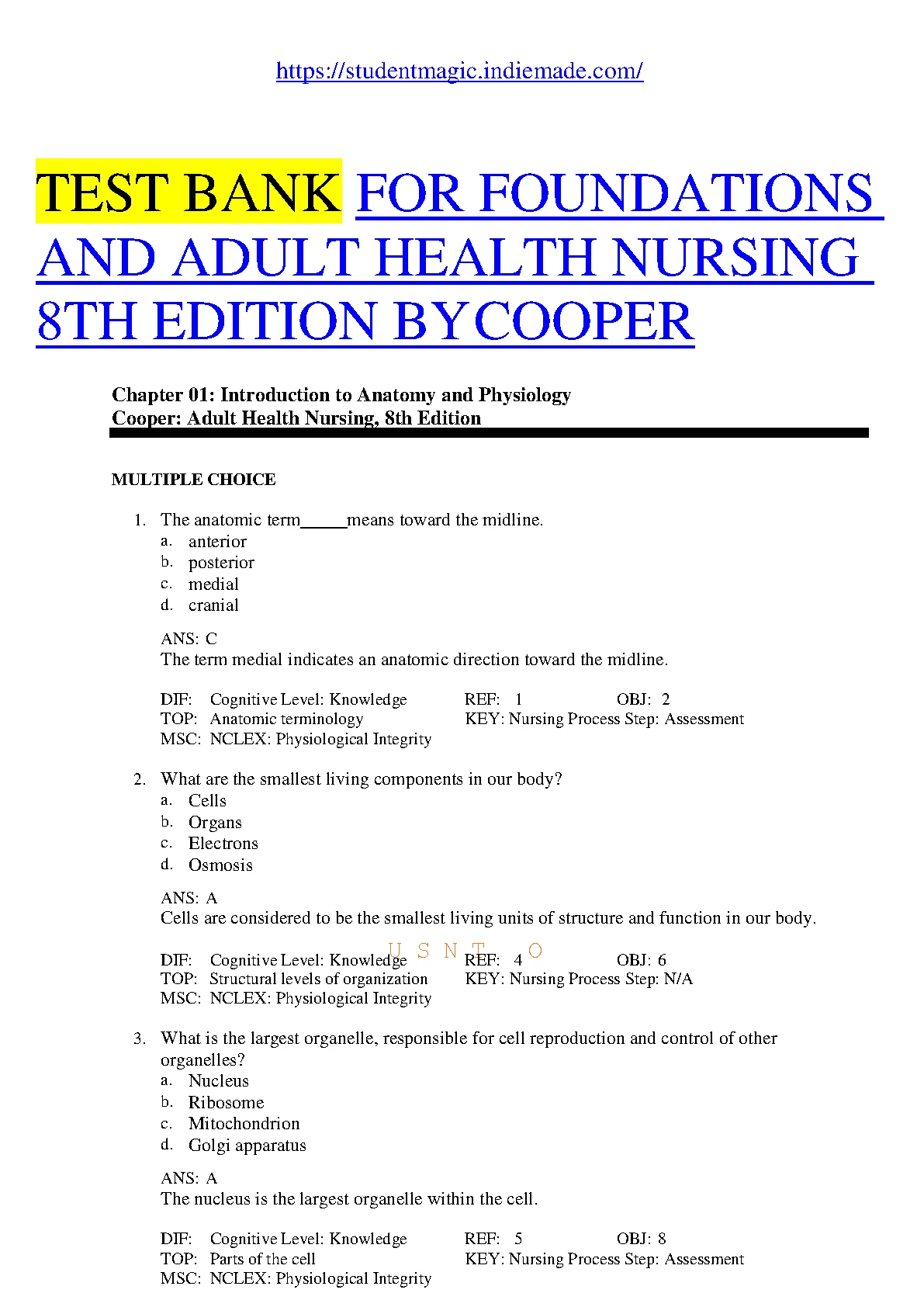 TESTBANK FOR FOUNDATIONS AND ADULT HEALTH NURSING 8TH EDITION BY COOPER. TESTBANK FOR FOUNDATIONS AND ADULT HEALTH NURSING 8TH EDITION BY COOPER TEST BANK