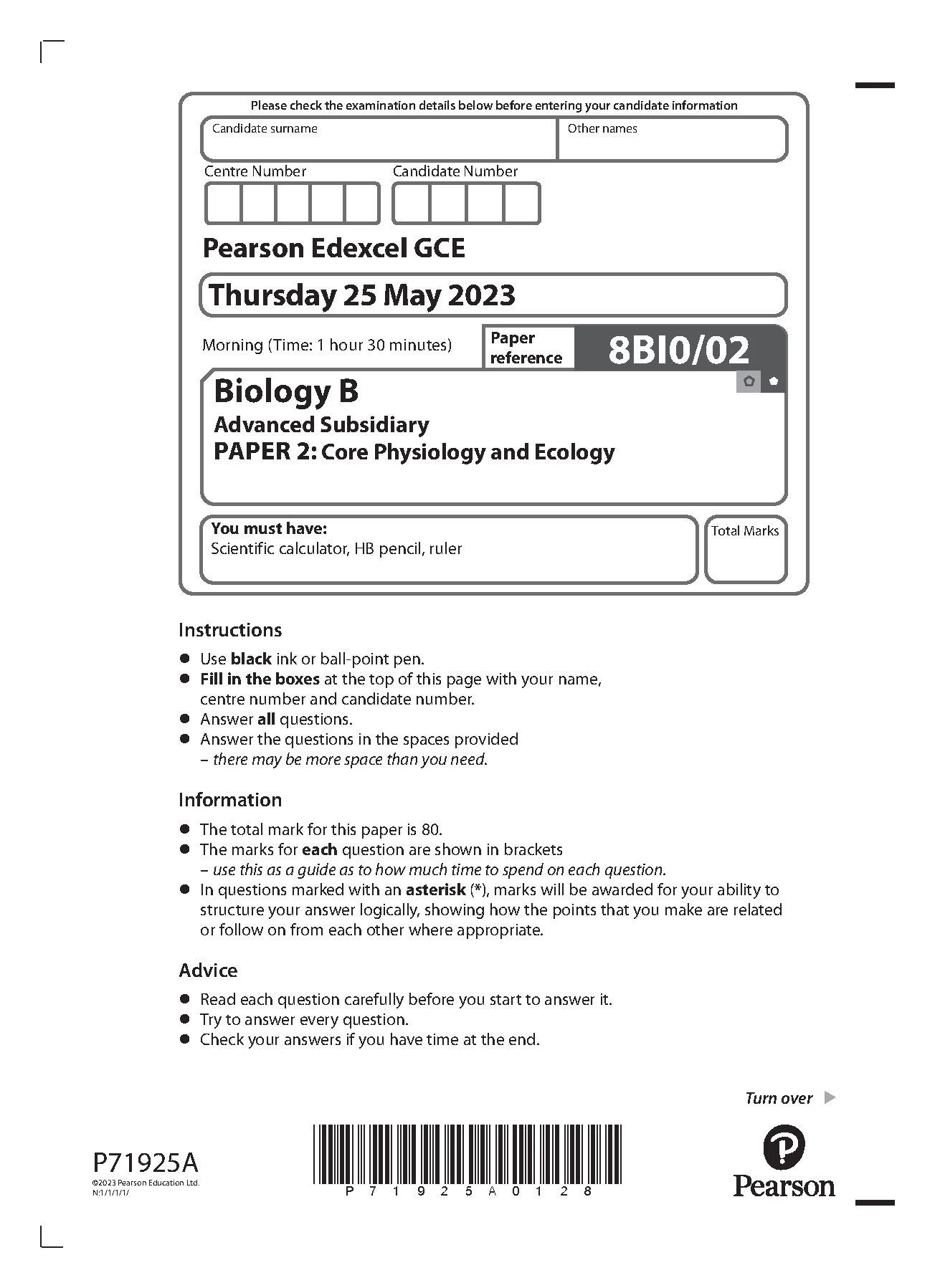 2023 Pearson Edexcel A Level Biology B Question Paper 2 (9BI0/02: Advanced Physiology, Evolution and Ecology). 2023 Pearson Edexcel A Level Biology B Question Paper 2 (9BI0/02: Advanced Physiology, Evolution and Ecology) Pearson Edexcel A and AS Papers and Mark Schemes