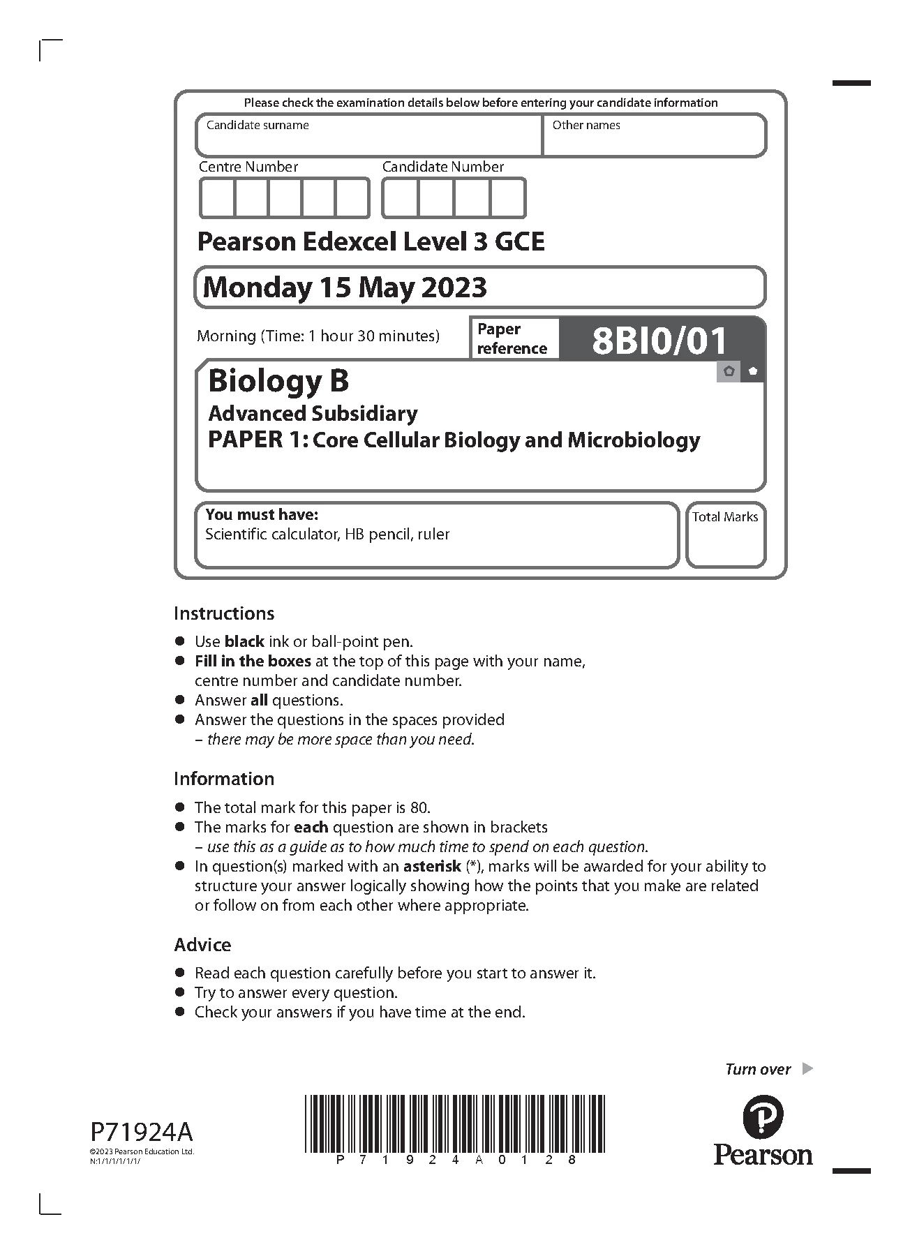 2023 Pearson Edexcel A Level Biology B Question Paper 1 (9BI0/01:  Advanced Biochemistry, Microbiology and Genetics). 2023 Pearson Edexcel A Level Biology B Question Paper 1 (9BI0/01:  Advanced Biochemistry, Microbiology and Genetics) Pearson Edexcel A and AS Papers and Mark Schemes