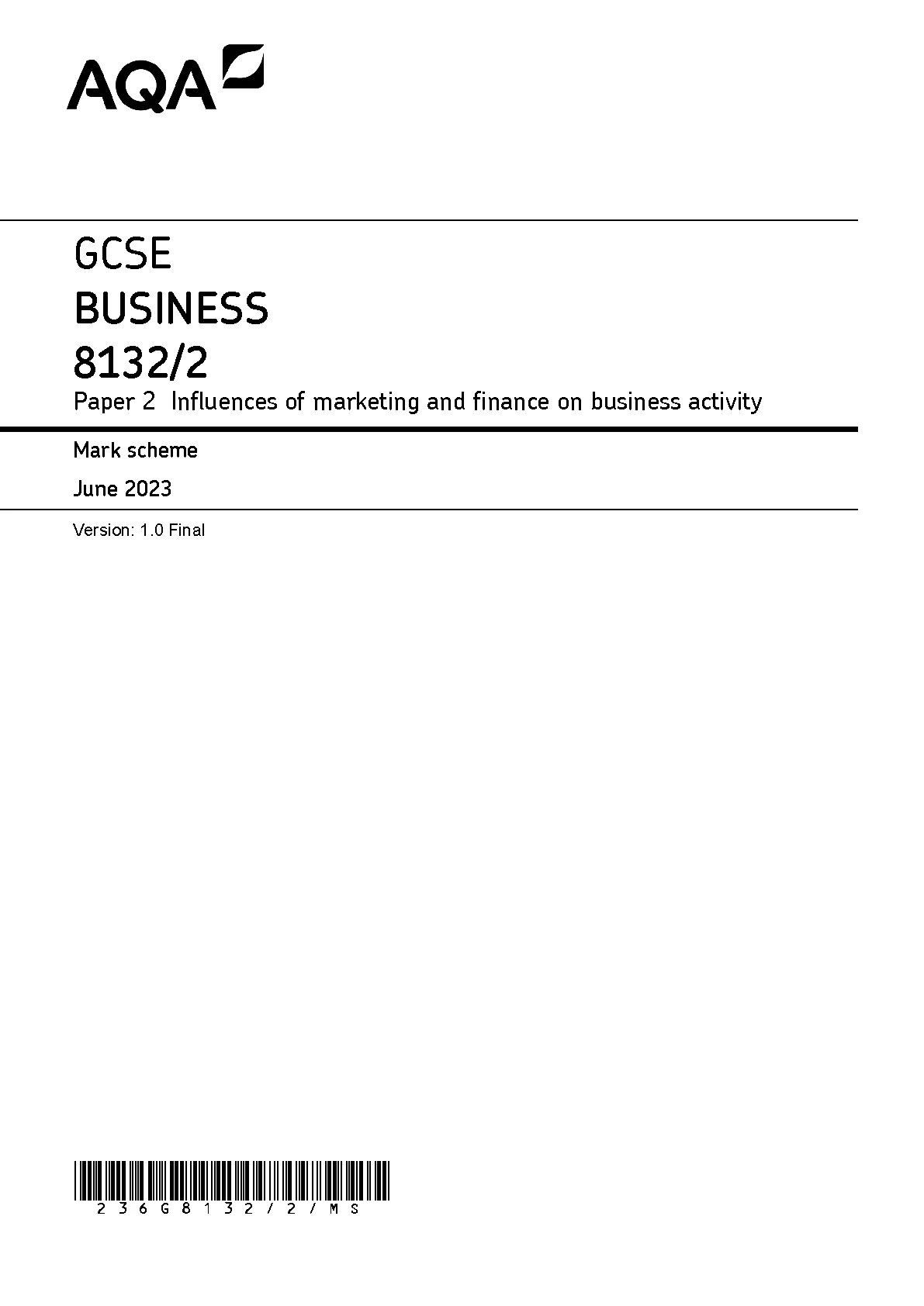 AQA GCSE BUSINESS PAPER 2 MARK SCHEME 2023 (8132/2: Influences of marketing and finance on business activity). AQA GCSE BUSINESS PAPER 2 MARK SCHEME 2023 (8132/2: Influences of marketing and finance on business activity) AQA papers mark schemes